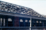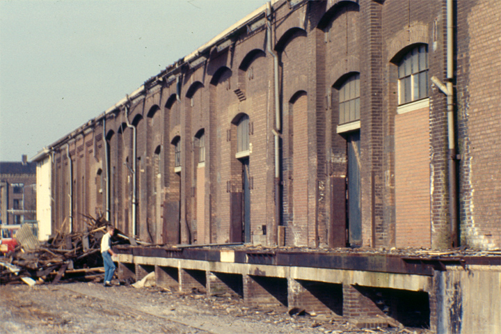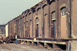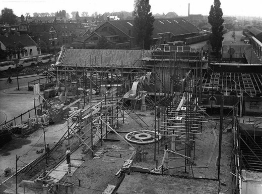 Gezicht op de zuidelijke vleugel van het in aanbouw zijnde N.S.-station 's-Hertogenbosch, met op de achtergrond de snel- en vrachtgoederenloods.