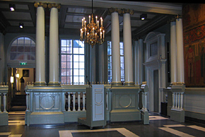 Een verslag van de rondleiding in het Stadhuis en De Raadskelder. Het huidige Bossche stadhuis bestaat in feite uit drie samengevoegde woonhuizen. Het brede middengedeelte is het 13de-eeuwse, stenen huis van de familie Leisscap. In 1366 wordt het 'Heerenhuis van Leisscap' door de stad aangekocht om te worden herbestemd tot raadhuis. Na ruim een eeuw wordt in 1481 het linkerbuurpand, de Gaffel genaamd, bij het stadhuis gevoegd. Tussen 1529 en 1533 worden beide samengevoegde panden grondig verbouwd. De voorgevel wordt vernieuwd, het bordes krijgt een dubbele trap, en de deels boven het maaiveld gelegen kelders worden aangebracht. De gevel wordt versierd met beelden, het stadswapen en een klok. Bij de verbouwing is Jan Derkennis, bouwmeester van de Sint-Jan, nauw betrokken. Mogelijk zijn de hardstenen afdekstenen op de trappen van de gevel van zijn hand. Deze zijn de vroegste renaissance elementen in Den Bosch. Het rechterbuurpand was rond 1530 in bezit gekomen van het Sint-Nicolaasgilde van de kramers en gebruikt als gildehuis. In 1599 wordt ook dit gebouw, Sinter Claes genaamd, door de stadsregering aangekocht en bij het stadhuis gevoegd. Het stadhuiscomplex is in de 17de eeuw verder vergroot met de bebouwing langs de Ridderstraat. Naar aanleiding van ontstane schade door de stadsbrand van kerstnacht 1669, begint men in 1670 aan een verbouwing. Deze verbouwing zal echter neerkomen op een bijna gehele nieuwbouw van het stadhuis. De drie afzonderlijke gevels verdwijnen en veranderen van een Brabants-laatgotische in een Hollands-barokke pui, zeg maar van een katholieke in een protestante bouwstijl. Bij de grote verbouwing blijven de kelders en zijmuren van de vroegere middeleeuwse panden gespaard. Onderdelen van de het voormalige 16e-eeuwse bordes worden verplaatst naar de binnenplaats van de Hof van Zevenbergen. Het exterieur van het stadhuis is vanaf 1670 tot op de dag van vandaag bewaard gebleven. Rondleiding StadhuisOp zaterdag 9 december 2006 hadden zich zo'n veertig personen verzameld in de grote hal van het Stadhuis aan de Markt. Verdeeld over twee groepen, onder deskundige leiding van de enthousiaste stadsgidsen Gerdie de Zeeuw-Nieuwenhuis en Guus Smits, ging de gecombineerde rondleiding in het Stadhuis/De Raadskelder van start.Het interieur van het Stadhuis kent een rijke overlevering uit verschillende tijdsperiodes. Als je het Stadhuis binnenkomt, zijn aan weerszijden van de benedenhal de metershoge muurschilderingen van Antoon Derkinderen te bewonderen. Aan de linkerkant schilderde de Bossche kunstenaar in 1892 de stichting van de stad door Hertog Hendrik I en aan de rechterkant in 1897 -in een totaal andere stijl- de bouw van de Sint-Jan. Achter in de hal bevindt zich de Vierschaar. In deze rechtbank werd tot ongeveer 1794 rechtspraak gehouden door de schepenen. De gestraften werden van daaruit naar het schavot op de Markt geleid voor de openbare terechtstelling. Links voorbij de Vierschaar komen we bij de Romangalerij, genoemd naar de ontwerper Jacob van Roman. De galerij vormt de verbinding tussen het hoofdgebouw uit 1670 en het achtergebouw uit 1563. Kijken we in deze Romangalerij naar boven, dan wanen we ons in een schip. De plafonds zijn geconstrueerd als houten scheepbodems. Als we verder doorlopen, nog wat trappetjes op, komen we via een antichambre en een hal bij twee gebeeldhouwde deuren (ontworpen door Frans van der Burgt). Daarachter geven al meer dan driehonderd jaar paartjes elkaar het jawoord. Want daar bevindt zich de trouwzaal van het Bossche stadhuis. De wandbekleding van de trouwzaal is van kalfsleer. Door een speciale behandeling met zilver en daarna een gele vernislak lijkt het op goudbehang, een zeer kostbaar behangetje. Wanneer we teruggaan naar de benedenhal, komen we via de Heerentrap (waarover de schepenen zich begaven naar de raadsvergaderingen) bij de Oranjegalerij. Aan de wanden hangen portretten van koningin Beatrix en voormalige vorsten en stadhouders uit de Nassaudynastie, vandaar de naam Oranjegalerij. Op de vloer het karpet met de plattegrond van Den Bosch, dat in de jaren 1973-1974 geweven werd naar de kaart van Joan Bleau uit 1649. Dwars over de vloer, onder het karpet door, loopt de Bossche meridiaan. Dat is een koperen strip die, in combinatie met een geperforeerd raam, de zonnetijd aangeeft: wanneer een bundel zonlicht door het gaatje in het raam schijnt en precies op de koperen strip valt, is het 12.00 uur. De Oranjegalerij geeft toegang tot de oude raadzaal. De plafonds en schoorsteenmantel van de oude raadzaal zijn ontworpen door Jacob Roman. De geweven wandtapijten zijn van Maximiliaan van der Gucht (1679). Op de eerste verdieping van het Stadhuis bevinden zich ook de Burgemeesterskamer, met wandschilderingen van Theodoor van Tulden (1650), de Wethouderskamer, uitgevoerd in rococo-stijl naar een ontwerp van de Bossche architect Verhellouw (1763), de Vergaderruimte van Burgemeester en Wethouders, waarvan de wanden bekleed zijn met goudleerbehang en de Secretariskamer, met zijn fraaie, houten lambrisering. Op alle kamers en zalen, langs de muren, en op vele andere plaatsen, hangen fraaie schilderstukken van jonge en oude, bekende en minder bekende meesters. Historie De RaadskelderDe Raadskelder is nu een café-restaurant met verschillende zalen, die gelegen zijn in de vier laatgotische kelders onder het Stadhuis. Onder het genot van koffie of thee met een Bossche bol vertelde eigenaar Tonny Rademaker Jr. de deelnemers iets over de historie, die nauw verbonden is met die van het Stadhuis.De kelders hebben hun huidige kruisribgewelven gekregen bij de verbouwing van 1529-1533 van het Stadhuis. De oorspronkelijke bestemming van De Raadskelder was ontvangst- en feestzaal voor schout en schepenen. Belangrijke personen als keizer Karel V, Philips II van Spanje, prins Willem van Oranje, de hertog van Alva, keizer Maximiliaan van Oostenrijk en Napoleon zijn er ontvangen. De kelders worden halverwege de 16e eeuw echter ook als gevangenis benut. Tijde