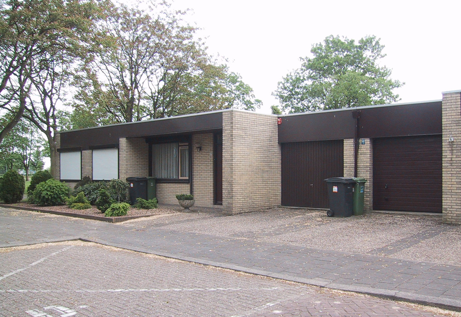 Geschakelde bungalows. De woningen zijn twee aan twee gespiegeld waarbij de rooilijn om de twee woningen verspringt. De woningen worden gekenmerkt door de ruime voorterreinen waarbij de beperkte hoogte en het feit dat de woningen geschakeld zijn een aantrekkelijke indruk maken. Elke woning heeft vijf traveeën, bestaande uit twee grote vensters, twee traveeën worden ingenomen door een nis met venster en voordeurpartij en de vijfde travee wordt ingenomen door de inpandige garage. Tussen de zijmuren worden de woningen aan de bovenkant begrensd door een brede betimmering in plaatmateriaal dat tevens de daklijst vormt, samen met een smalle zinken lijst van het platte dak. Aan de achterzijde van de woningen bevindt zich een kleine tuin, begrensd door een wandel- en fietspad langs de oever van de Pettelaarse plas.
