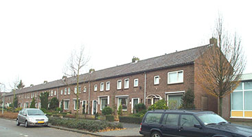 Woningblok met 14 woningen onder één zadeldak. De plattegronden zijn gespiegeld. Op de begane grond is de gevelindeling: voordeur met daarnaast een groot ongedeeld venster. Op eerste etage een klein traphalvenster en twee staande vensters. De woningen bestaan uit twee bouwlagen; het doorlopende zadeldak is gedekt met pannen. De uitvoering is in schoonmetselwerk in licht rode baksteen. Door vervanging van de originele houten kozijnen en vensters door aluminium exemplaren worden de gevels gedomineerd door de maten van het staande en draaiende materiaal waarin het nu is uitgevoerd.