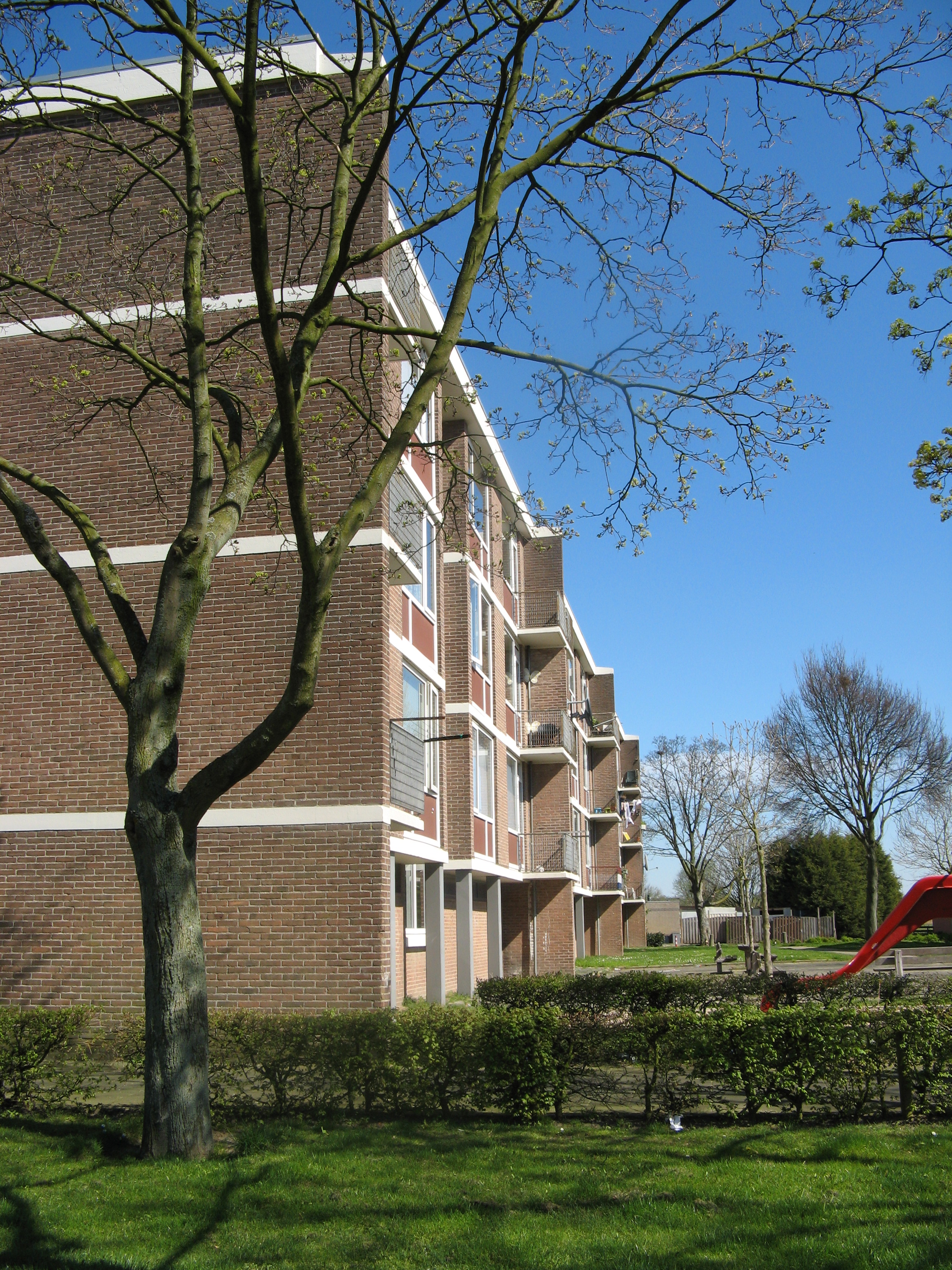 Flat woningen met onderbouw en drie woonlagen. Van dit type flatgebouw zijn er in deze wijk een zestal gebouwd in verschillende afmetingen. In de onderbouw op de begane grond zijn de bergingen en de toegangen tot de trappenhuizen ondergebracht. De wanden van de onderbouw zijn naar achteren geplaatst zodat de dragende beton kolommen vrijstaande kolommen. Deze kolommen zijn voorzien van een kleur, die bij elke flat verschillend is. De trappenhuizen zijn voorzien van een groot kozijn over alle verdiepingen met verdeling 2 x 7. De voorzijde van het trappenhuis kozijn ligt dieper in de gevelwand, waardoor een geleding ontstaat. Elke woning heeft een groot venster en een kozijn met een deur naar het balkon.