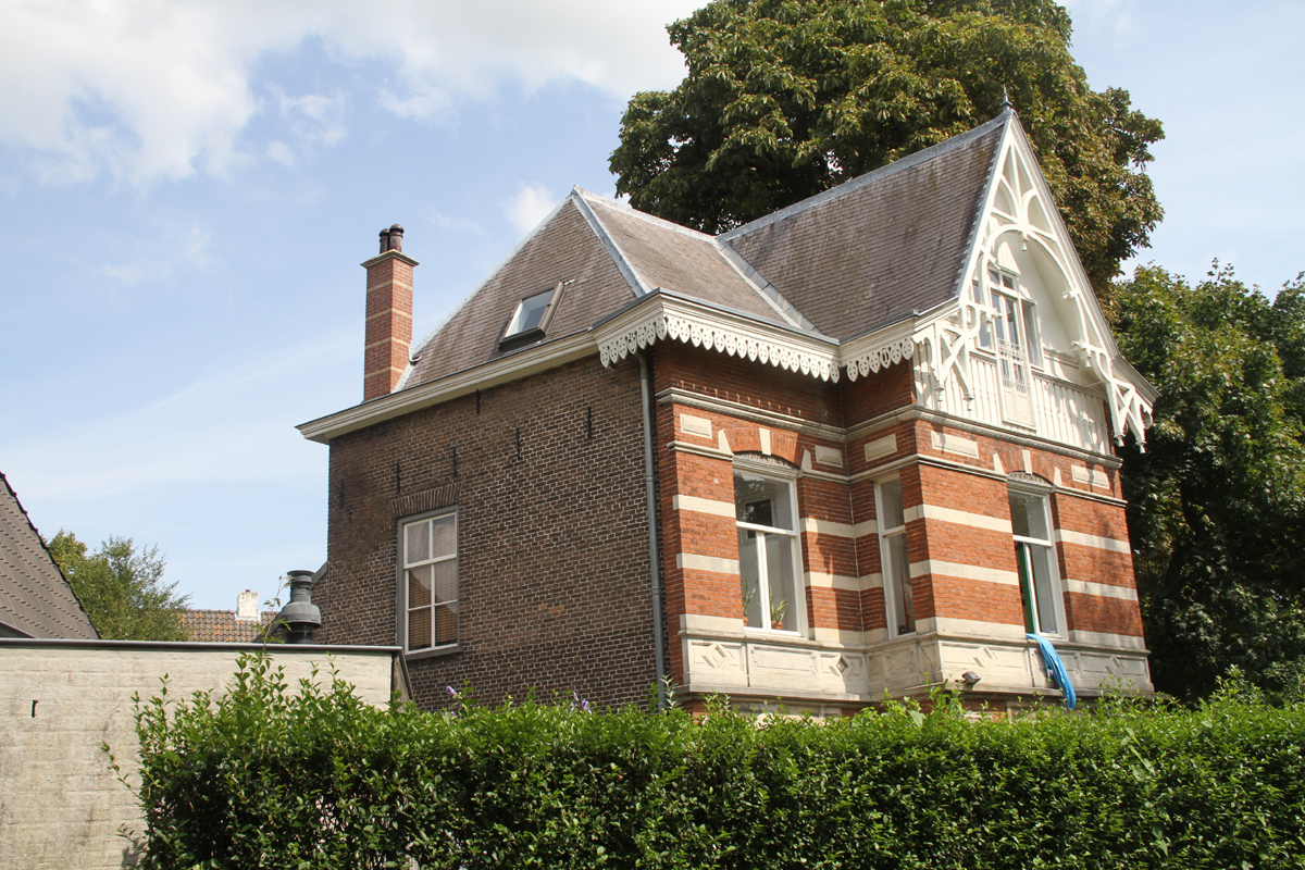 Een huis van een opmerkelijke bouwstijl, verscholen in een groene oase midden in de stad. Over de geschiedenis van het pand is niet erg veel bekend, maar in de zeventiende eeuw werd het al bewoond en gebruikt door blekers. De in 1950 gedempte Parkstroom van de Binnendieze liep pal langs het door Marijn Smits en Lucy de Graaf en hun zoon Cesar bewoonde huis aan het Bleekerstraatje 3. Marijn laat een muuranker zien dat aan de zuidoostelijke zijgevel van het huis maar net boven de grond uitsteekt. "Daaruit blijkt duidelijk dat dit ooit een kademuur was." Verder naar achteren buigt de gevel, de voormalige Diezeloop volgend, naar links. Het Bleekerstraatje eindigde vroeger achter het huis in een brede trap naar het water. "Een wasplaats. Vóór 1900 moeten in dit huis blekers hebben gewoond, die hier linnengoed wasten en te bleken legden. Veel meer weten we niet." In 1623 worden het 'bleekhuis' en twee daarbij gelegen bleekvelden genoemd in een akte bij de verdeling van een nalatenschap. Aanvankelijk zouden de bleekvelden, gelegen aan weerszijden van de Binnendieze tussen de toenmalige Vughterdijk (nu Vughterstraat) en de stadsmuur, hebben toebehoord aan de kruisbroeders. In 1770 is nog steeds sprake van een 'bleek met woning en waschhuis'. In die periode lag bij het huis een bruggetje over de Binnendieze, en was het ook bereikbaar vanaf de Kuipertjeswal. Op oude stads-plattegronden is te zien hoe het terrein tussen de Parkstroom en de stadsmuur, later stadswal, tot in de twintigste eeuw open is gebleven. Op de plattegrond van Jos van Hagens (omstreeks 1890) zijn het bleekhuis langs de Binnendieze en het bruggetje duidelijk herkenbaar. Op een luchtfoto uit 1930 schittert het huis, aan de rand van een groene oase midden in de stad. De kastanjes en esdoorn naast het huis hebben inmiddels de monumentale hoogte bereikt van wel 25 meter. Het bruggetje is verdwenen en het huis ligt nu aan de rand van een buurtparkje, met speeltoestellen, achter de bebouwing van Vughterstraat, Kuipertjeswal en Parklaan. Vanaf de Kuipertjeswal is het huis, tussen andere huizen door, op een afstand te zien. Wie de hoofdtoegang neemt door het Bleekerstraatje, stuit aan het eind op een hek waarachter de voordeur zich bevindt. Een andere entree is via het in 1985 aangelegde parkje. De bezoeker ziet een prachtige, hoge gevel van bak- en natuursteen in chaletstijl, die zijn beëindiging vindt in een houten top met een door opengewerkte elementen fraai versierde, overkragende gevellijst. Een typisch voorbeeld van 'fin-de-siècle-gekte', noemt Smits de voorgevel, die omstreeks 1900 tegen het huis aan is gebouwd. "Zoals je ook in de wijk Het Zand ziet. Aan de onderzijde harde natuursteen, dan Belgische baksteen afgewisseld met zachtere natuurstenen lagen. Koloniale invloed is dat. De huizen van het Tilmanshofje hiernaast hebben dezelfde stijl. Alleen zijn de gevels dáár oorspronkelijk." Aan de structuur van het metselwerk op de hoeken is goed te zien dat de tweede voorgevel, 25 centimeter dik, 'gewoon' vóór het bestaande huis is gezet. In en aan het huis is veel gerestaureerd en aangelegd, want het ontbrak aan alles. "Er was niet eens warm water. In onze huidige woonkamer lag een vloer van straatstenen. Die ruimte werd dan ook voor opslag gebruikt. De vorige bewoners woonden in wat nu onze hal en keuken zijn." Op de eerste verdieping is een hele rits kleinere kamertjes. OrangerieVan een deel van de benedenruimte van het huis, nu achter de woonkamer, maakte Smits een berging. De straatstenen liggen daar nog steeds. "Dit is nooit echt als woonhuis bedoeld geweest. Na de periode van de blekers was dit een orangerie, een overwinteringsplaats voor planten, van de familie Tilman. De tuinman van de familie woonde hier. Die orangerie is onze huidige woonkamer." C. Tilman woonde in een herenhuis aan de Vughterstraat. Het bleekhuis was zijn eigendom. De erven lieten op het achterter- | 267 |