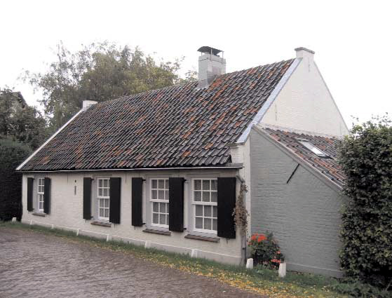 BeschrijvingAlgemeen:Het negentiende-eeuwse vrijstaande pand aan de noordzijde van de Graaf Engelbertstraat heeft een rechthoekige grondslag en is met de lange zijde aan de straat gelegen. Het pand omvat een begane grond en zolderniveau onder een met oranje en gesmoorde, oud Hollandse dakpannen gedekt zadeldak. Tegen de rechtergevel bevindt zich een iets smallere aanbouw onder een met pannen gedekt lessenaardak. De witgeschilderde gevels zijn in kruisverband gemetseld.Naar verluidt betreft het hier van oorsprong een rijtje van drie armenhuizen in het centrum van Bokhoven. In de jaren zestig van de twintigste eeuw is er rigoureus verbouwd waarbij de afzonderlijke woningen zijn samengetrokken tot één woning. Voorgevel:Bij de samentrekking van de woningen zijn de drie deuren en drie vensters in de straatgevel vervangen door vier nieuwe vensters. Met enige moeite zijn bouwsporen te onderscheiden die de oorspronkelijke plaatsen van de gevelopeningen aanduiden. De moderne vensters zijn voorzien van zesruits schuiframen en zesruits bovenlichten. De buitenraamluiken zijn gelijktijdig aangebracht. Elk van de vier vensters is voorzien van een keramische onderdorpel. De voorgevel, waarin een achttal gevelankers zichtbaar is, wordt aan de bovenzijde afgesloten met een zinken bakgoot.De voorgevel van de aanbouw is van oorsprong voorzien geweest van een deur onder een halfsteens rollaag. Deze gevelopening is later dichtgezet. De daklijn is voorzien van vlechtingen en een gordinganker. Linkerzijgevel:De top van deze tuitgevel verdwijnt achter houten regelwerk, gevat in een sierlijke windvaan. In deze gevel bevindt zich de moderne voordeur onder een houten overkapping.Rechterzijgevel:De rechterzijgevel gaat op begane grond niveau nagenoeg geheel schuil achter de aanbouw. De daklijn van de tuitgevel is voorzien van vlechtingen. De schouderstukken zijn enigszins uitgemetseld. Tuit en schouderstukken zijn voorzien van hardstenen dekplaten. Net boven de aansluiting van het lessenaardak is een kleine halfsteens rollaag, mogelijk van een dichtgezet hooiluik, zichtbaar. In de gevel is een drietal ankers van de kap waar te nemen.De rechterzijgevel van de aanbouw is vanaf de openbare weg niet zichtbaar. | 1 |
