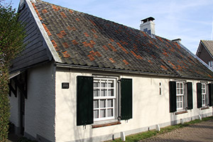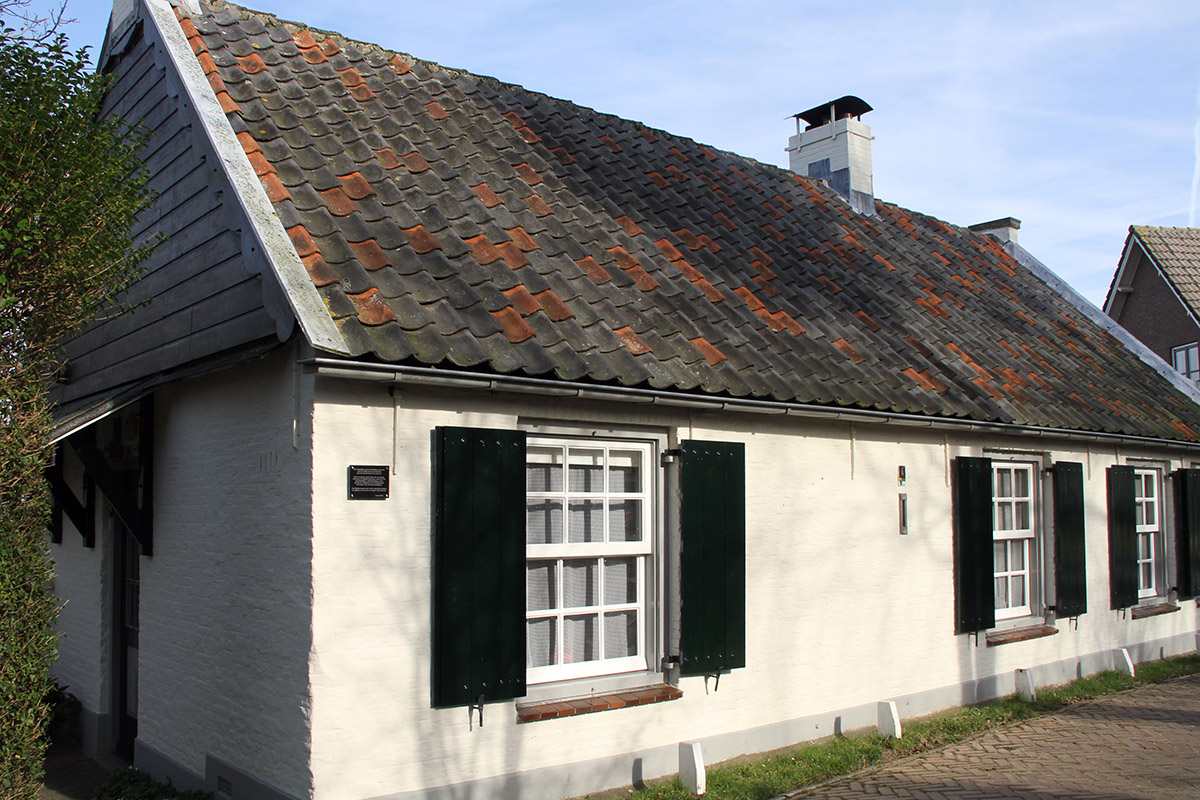 Achtergevel:Naar verluidt is de achtergevel van oorsprong blind geweest. Tijdens de verbouwing in de jaren zestig is in het midden een breed raam aangebracht. Aan weerszijden van dit raam bevindt zich een venster. Links een venster met dubbele zesruits draairamen, rechts een venster met vierruits schuivend onderraam en vast vierruits bovenlicht. Beide vensters zijn voorzien van buitenluiken. Het dakschild is voorzien van een dakkapel onder lessenaardak met aan weerszijden een modern dakraam. De houten dakkapel heeft een drietal draaiende vierruits ramen. Het dak is voorzien van een mastgoot.Het muurwerk van de aanbouw is geheel modern. Het schone metselwerk heeft een moderne deur en een vierruits venster. In het muurwerk is een gordinganker waar te nemen. Interieur:Het interieur behoorde niet tot deze verkenning.Redengevende omschrijvingHet pand heeft monumentale waarde vanwege de gevels, de bouwmassa en de situering. De oorspronkelijke functie als armenwoningen draagt bij aan de sociaalhistorische waarde van het pand. | 2 |