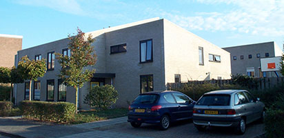De bouwmassa van dit wooncomplex bestaat uit drie elementen van ongeveer hetzelfde volume. Aan de voorzijde steekt daarbij het middeldeel naar voren uit. De daken zijn uitgevoerd als lessenaardak. Het middendeel loopt af naar de straatzijde; de twee lessenaardaken van het linker en rechter element lopen af naar de achterzijde. Aan de Brugmanstraat is hetzelfde bouwvolume gerealiseerd. De open binnenruimte tussen deze twee gebouwen is ingericht als een recreatie gebied. De voorgevel bestaat uit acht traveeën aan de straatzijde met beganegrond en een bouwlaag, met links en rechts van het middeldeel een toegangspartij met portaal. Aan de achterzijde treffen we drie bouwlagen aan met in de derde bouwlaag 8 kleine vierkante vensters. Het gebouw is aan de zijde van de Geert Grootestraat ruim omgeven door groenaanleg en jonge bomen.