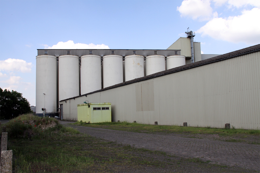 InleidingDe voormalige meelfabriek uit 1909 is gebouwd voor de heer H. Bruyelle, naar ontwerp van de architect F.C. de Beer in Traditoneel-Ambachtelijke stijl. Zij bevindt zich op de oostelijke punt van het bedrijfsterrein, dat is gelegen buiten het negentiende-eeuwse centrum van 's-Hertogenbosch en langs de Dieze, in de noordelijke uithoek van de wijk Het Zand, waar zich veel bedrijvigheid heeft gevestigd. Sinds 1948 maakt het fabrieksgebouw onderdeel uit van het mengvoederbedrijf Koudijs, dat in de loop der tijd sterk is uitgebreid, waarbij de insteekhaven langs de Dieze is gedempt.De maalderij en het magazijn zijn nu in gebruik voor opslag, de wasserij wordt gebruikt als kantoorruimte en de silo's zijn buiten gebruik. Een tegeltableau uit 1950, dat zich in het trappenhuis van het belendende pand bevindt, verschaft informatie over omvang en aanzien van het oorspronkelijke complex. OmschrijvingDe meelfabriek is op U-vormig grondplan gebouwd, met in de oksel het trappenhuis, uitlopend in de watertoren, die boven het gebouw uitsteekt. In later tijd is ook de binnenplaats bebouwd, waarmee het gebouw een vierkant grondplan heeft gekregen. In de bakstenen oostvleugel, die evenwijdig aan de Dieze is gelegen, waren het magazijn en de wasserij ondergebracht, in de bakstenen zuidvleugel bevond zich de maalderij, terwijl het betonnen silogedeelte de noordvleugel vormt. Alle vleugels alsmede de bebouwde binnenplaats hebben een plat dak. Zowel de oost- als de zuidvleugel telt vijf bouwlagen en is zeven traveeën lang en vier breed. De traveeën worden van elkaar gescheiden door lisenen. Elke travee omsluit op elke verdieping een gepaard venster onder dubbele segmentboog, gevuld met rechtgesloten ramen met roedenverdeling. Op de bovenste verdieping ontbreken evenwel de segmentbogen. Op de begane grond omvat elke travee een enkel rechtgesloten venster met ramen in roedenverdeling. De derde travee in de oostgevel is, evenals de tweede in de zuidgevel, op elke verdieping voorzien van laaddeuren. De houten vloeren in de oost- en zuidvleugel worden gedragen door ijzeren onderslagbalken, die op hun beurt rusten op ronde gietijzeren kolommen met licht geprofileerde kapitelen. De bovenverdieping kent evenwel houten standvinken, die de houten kapconstructie dragen. De noordvleugel, bestaande uit het betonnen silogedeelte, is van dezelfde hoogte als de twee andere vleugels en telt drie rijen van vier silokokers, die op de begane grond uitlopen in rechthoekige trechters. Twee van de drie rijen trechters zijn verwijderd. De bovenverdieping bestaat uit een grote ruimte, met in de vloer mangaten die toegang geven tot de silokokers. De zoldering wordt gedragen door betonnen kolommen, die een betonnen kapconstructie dragen. Het trappenhuis, uitlopend in de vierkante watertoren is opgetrokken uit baksteen en kent een betonnen trap en dito waterreservoir ten behoeve van de sprinklerinstallatie. De toren heeft een tentdak, belegd met verbeterde Hollandse pannen. In de noord- en zuidgevel is een drietal hoge, rechtgesloten vensters aangebracht, met ijzeren ramen in roedenverdeling. Daarboven is een rondvenster met ijzeren raam geplaatst. Een zelfde venster is in de andere gevels aangebracht. Langs het trappenhuis loopt een takelschacht, met luiken in elke vloer. In de ruimte onder het waterreservoir, is de bijhorende houten lier geplaatst.WaarderingDe meelfabriek is van algemeen belang. Zij heeft cultuurhistorische waarde als illustratief voorbeeld van het voor de tijd moderne type meelfabriek, met de voor dit type kenmerkende ligging, omvang en vormgeving. Zij heeft architectuurhistorische waarde als voorbeeld van sobere en doelmatige fabrieksarchitectuur en vanwege de plaats die het gebouw inneemt in het veelzijdig oeuvre van de architect F.C. de Beer. Het gebouw heeft bouwhistorische waarde vanwege de toegepaste materialen, met name de gietijzeren kolommen, de betonnen silo's en het betonnen waterreservoir. Het heeft ensemblewaarde vanwege de herkenbare functionele samenhang met de wijk en als beeldbepalend element hierin. Het is zeldzaam als voorbeeld van het eertijds gangbare type moderniserende meelfabriek en is bovendien gaaf behouden. |