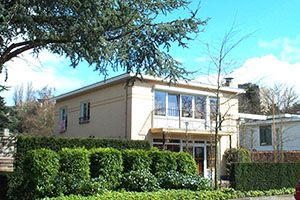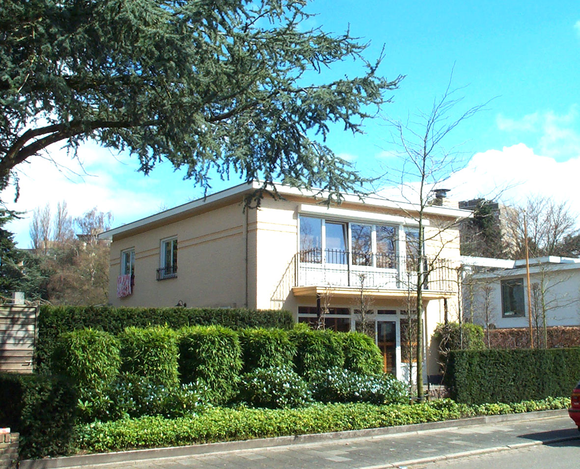 Herenhuis of villa met rechthoekige plattegrond met twee bouwlagen en aanbouw met garage in een bouwlaag. De smalle zijde van de rechthoek vormt de voorgevel. Voordeurpartij in de zijgevel. Een samengesteld kozijn in de eerste bouwlaag, met openslaande deuren en links en rechts vaste delen, geeft toegang tot de voortuin. Het met stalen kolommen ondersteunde luifel vormt hier het balkon voor de tweede bouwlaag, waar eenzelfde samengesteld kozijn de symmetrie van de voorgevel benadrukt. Opvallende zijn de grote overstekken rondom het bouwvolume en de decoratieve, in baksteen uitgevoerde, dubbele band, halverwege de tweede bouwlaag. Zoals alle vrijstaande woningen in deze straat is ook dit object uitgevoerd met een plat dak. Niet bekend is of voor deze straat, met betrekking tot het daktype, uniforme voorschriften in het bestemmingsplan werden opgenomen.