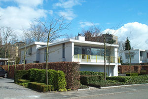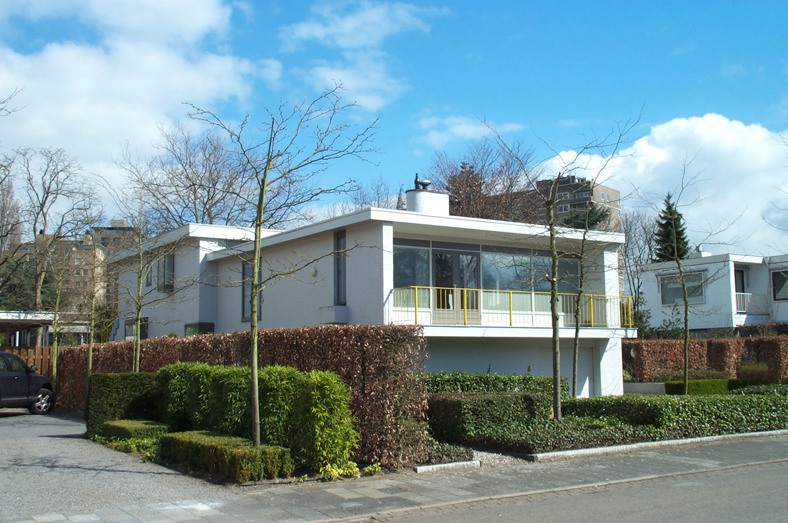 Herenhuis - villa met een plattegrond die de indruk bevestigd dat het pand uit twee delen bestaat; twee vierkanten waarvan het voorste deel verdiept is aangelegd. Het voorste gedeelte van de woning herbergt een half onder het maaiveld aangelegde garage. Het balkon over de gehele breedte van de voorgevel vormt samen met het terugliggende kozijn van de tweede bouwlaag het opvallende aanzicht van deze woning. Opvallende zijn bovendien de overstekken, de ovale vorm van de schoorsteen en de plastisiteit door de verschillende hoogten van de bouwelementen. Zoals alle vrijstaande woningen in deze straat is ook dit object uitgevoerd met een plat dak. Niet bekend is of voor deze straat, met betrekking tot het daktype, uniforme voorschriften in het bestemmingsplan werden opgenomen.