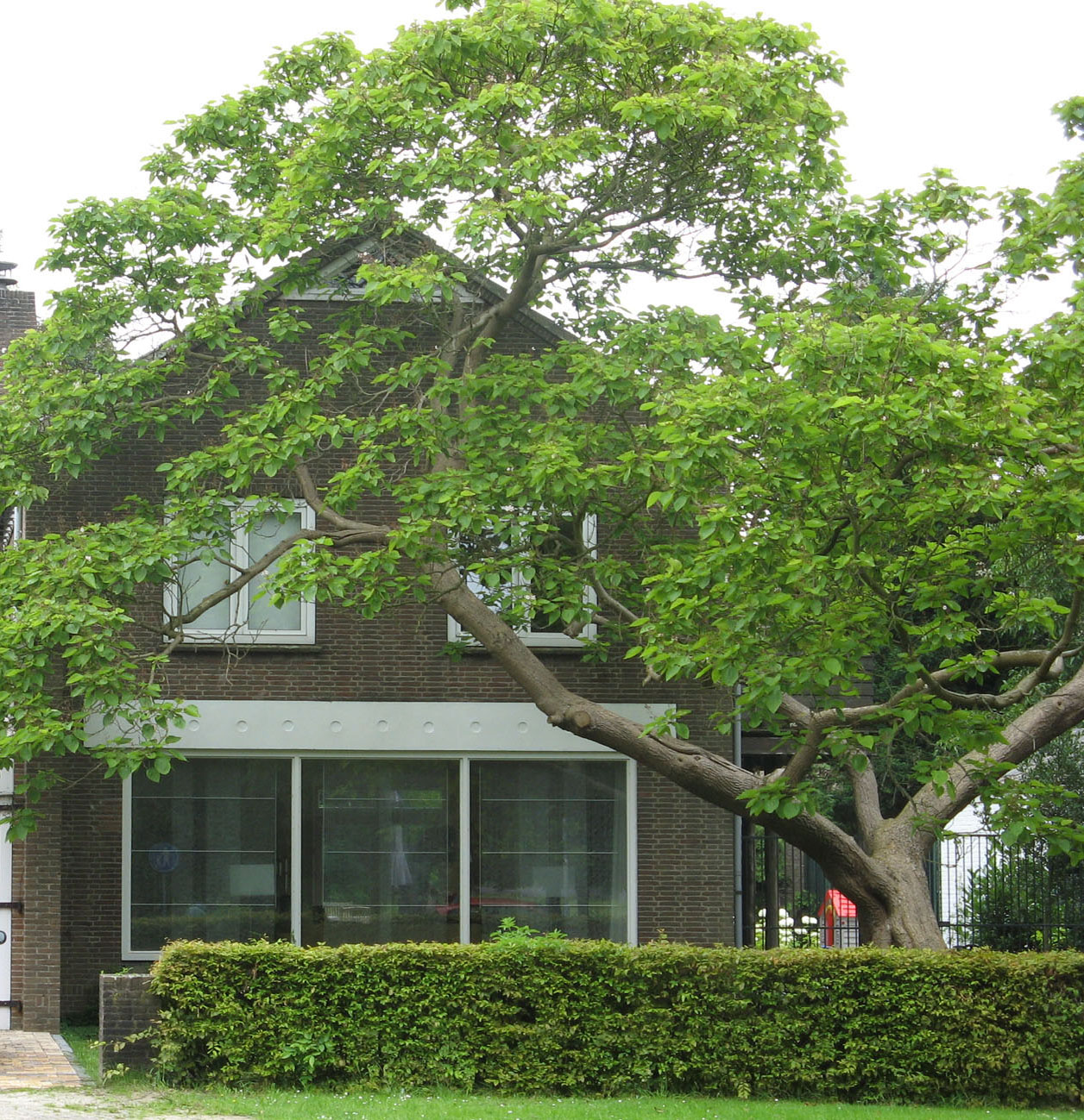 Vrijstaande woning met garage. De woning staat met de korte zijde gericht naar de straat. In deze gevel, bestaande uit twee traveeën, worden op de beganegrond de beide traveeën in genomen door een groot venster. Dit venster heeft een verticale roede verdeling in de verhouding 1-2-1. Het grote vensterkozijn is enigszins naar buiten geplaatst en aan de bovenzijde voorzien van een breed boord. Op de eerste bouwlaag zijn twee gelijkvormige openslaande vensters aangebracht. In de topgevel bevindt zich onmiddellijk onder de nok, een driehoekig venster. De garagemuur bevindt zich ca. 1 meter voor de muur van de voorgevel van het huis. De garage is gedekt met een lessenaardak. Aan de rechtergevel is een balkon. Het zadeldak van de woning is met pannen gedekt. De licht overkragende goot heeft geen borden; de zinken bakgoten worden gedragen door ijzeren steunen. Uitgevoerd in baksteen in schoonmetselwerk.