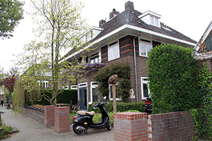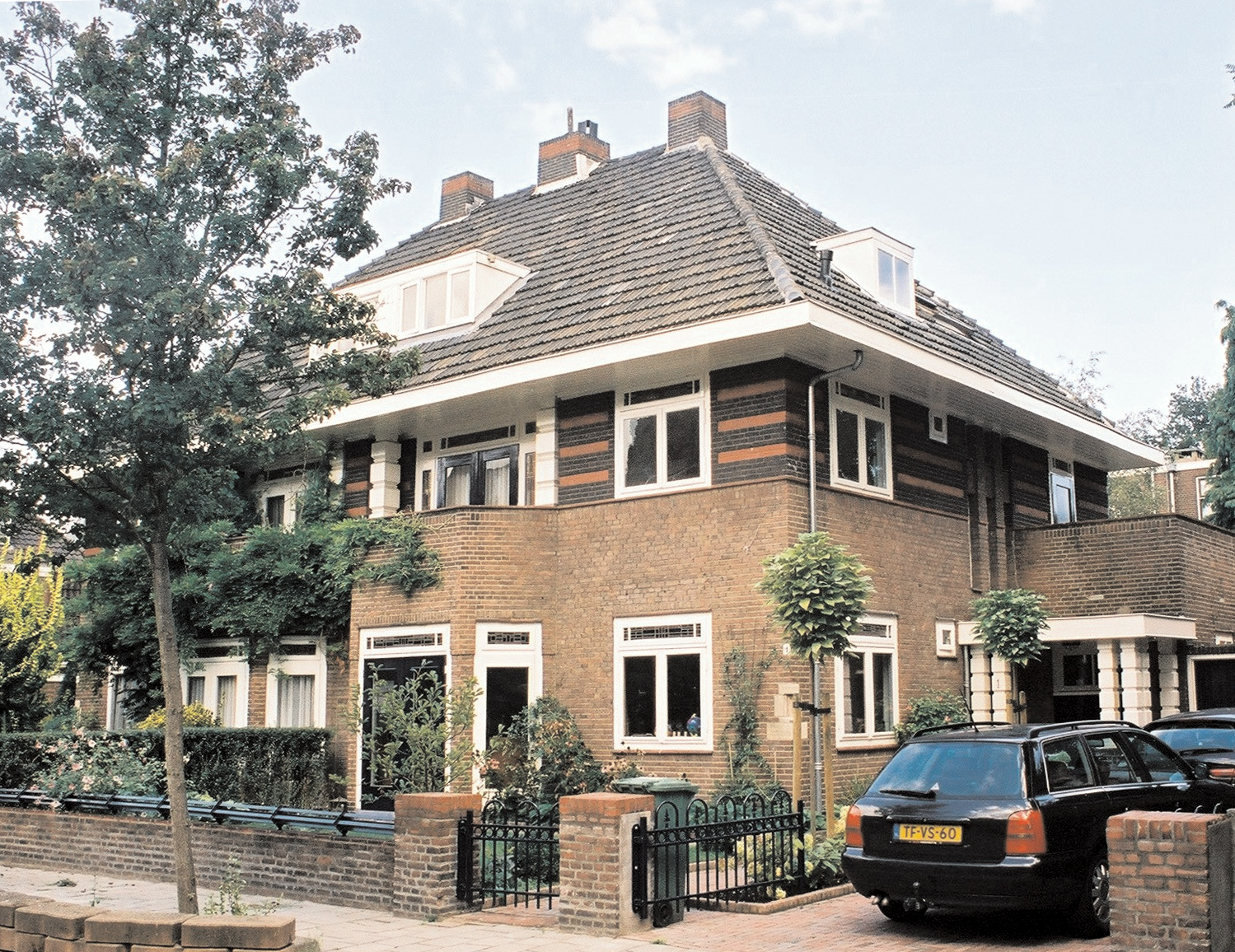 BeschrijvingAlgemeen:Enckevoirtstraat 1 vormt samen met het linkerbuurpand Enckevoirtstraat 3 een vrijstaande dubbelvilla onder één kap. Het pand maakt deel uit van de bebouwing tussen de Capucijnenlaan, de Koningsweg en de Van der Does de Willeboissingel, bestaande uit vrijstaande panden, die sinds het begin van de 20ste eeuw tot stand zijn gekomen. Het pand omvat twee bouwlagen onder een schilddak, dat is gedekt met gesmoorde muldenpannen. Karakteristiek voor het in Frank Lloyd Wright-achtige stijl gebouwde pand, is de afwisselende bouwmassa met diverse uitbouwen, een relatief lage eerste verdieping en een dominante kap met forse overstek. De oorspronkelijke bouwmassa is grotendeels nog aanwezig. De gevels zijn opgetrokken in schoon metselwerk van lichte steen met de toepassing van donkere baksteen als trasraam. Ter hoogte van de verdieping is het muurwerk gemetseld met donkere bakstenen, afgewisseld met horizontale, verdiepte banen van helrode baksteen. Het pand ligt terug ten opzichte van de rooilijn en heeft aan de voorzijde een tuin met een lage, stenen muur met een bijzondere metalen bekroning als erfscheiding.Voorgevel:Aan de voorzijde bevindt zich een uitgebouwde driekantige erker, voorzien van vensters en openslaande deuren. Op deze erker is op de eerste verdieping een balkon met hoge borstwering en een ten opzichte van de gevel verdiepte loggia. De openslaande deuren naar het balkon worden geflankeerd door twee smalle, hoge vensters en zijn voorzien van bovenlichten. Beide hoeken van het balkon worden gemarkeerd door zware, wit geschilderde pilasters die zowel in materiaal als in detaillering contrasteren met de baksteenarchitectuur van de gevels. In het muurvlak rechts hiervan is zowel op de begane grond als op de verdieping een venster met draairamen. De smalle bovenlichten, uitgevoerd met glas-in-lood, functioneren als klepraampjes. Het merendeel van de ramen en deuren is vernieuwd, daarbij gebruik makend van de bestaan-de kozijnen en met hergebruik van de oude scharnieren. Op de hoek van de voorgevel en de rechter zijgevel is overhoeks een natuurstenen brievenbus geplaatst. In het dakschild aan de voorzijde bevindt zich een moderne dakkapel en een drietal schoorsteenkanalen op de nok.Linkerzijgevel:De linkerzijmuur vormt de scheidingsmuur met het buurpand Enckevoirtstraat 3.Rechterzijgevel:In de rechterzijgevel bevindt zich de voordeur met een uitgebouwd toegangsportaal, gemar- | 1 |