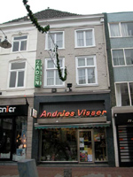 De twee vensterassen brede voorgevel is opgetrokken in baksteen en is geschilderd. De winkelpui op de begane grond dateert uit 1965-1966 en heeft rechts uit het midden een winkelingang. Verder is de met natuursteen bekleedde pui geheel gevuld met glas. De twee vensters op de verdieping bevatten kozijnen met duivejagersprofilering en toognagels met 2-ruits dubbele draairamen met vast kalf en een 2-ruits bovenlicht. De twee vensters op de tweede verdieping hebben dezelfde kozijnen met 2-ruits dubbele draairamen. Onder alle vensters zit een houten lekdorpel en boven de vensters een rollaag. Boven de vensters op de eerste verdieping en rechts in de gevel zijn zware kruisvormige ankers zichtbaar. De gevel wordt afgesloten door een hoofdgestel met architraaf, fries en gootlijst. Dit hoofdgestel loopt door over de gevel van het linker buurpand.