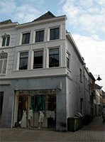 Context(Bouw)historie:Het pand Hinthamerstraat 16-18, vanouds genaamd “het Duifhuis” (1622) en “den Engelschen Handschoen” (1742), heeft een kern uit de 14de eeuw en een voorgevel van rond 1850 met een recente winkelpui. Het hoofdpand bestaat uit een ondiep voorhuis met daaraan vast een iets lager achterhuis. Daarachter staat het pandje Gasthuisstraat 4, dat waarschijnlijk uit de 19de eeuw dateert, en van oorsprong een bouwkundige eenheid vormt met Gasthuisstraat 6. In de 16de eeuw werd het hoofdhuis verbreed ten koste van een osendrup tussen nrs.16-18 en 14.In 1905 werd de winkelruimte geheel verbouwd en uitgebreid, waardoor de trap naar de verdieping van halverwege het pand naar de achterzijde moest worden verplaatst. In 1926 werd de winkel weer verkleind, maar werd de trap nog verder naar achter geplaatst, achterin Gasthuisstraat 4, waarvan de gevel en de indeling ook werden gewijzigd. In 1936 is een bovenwoning in het pand gecreëerd in plaats van magazijnruimte. In 1942 werd het pand op de begane grond samengevoegd met het buurpand nr.14, en werd de woning Gasthuisstraat 4 gewijzigd, toen zich een lunchroom in het pand vestigde. Later werd het een café-restaurant met een hotel, maar in 1955 werd het geheel verbouwd tot supermarkt met bovenwoningen, waarvoor de indeling sterk is gewijzigd. In 1987, toen er inmiddels een andere winkel in het pand was gevestigd, werd een souterrain gecreëerd halverwege de diepte van het pand, waarvoor de oude kelders (grotendeels) moesten wijken. In de 20ste eeuw is de winkelpui diverse malen gewijzigd. Ligging:Het pand is gelegen aan de noordzijde van de Hinthamerstraat op de westelijke hoek met de Gasthuisstraat. De Hinthamerstraat is al sinds de late 12de eeuw een van de drie belangrijke straten die het centrum van de stad (de Markt) met het omliggende gebied verbinden. Het onderhavige gedeelte van de Hinthamerstraat ligt net buiten de oudste omwalling van de stad, die uit de eerste helft van de 13de eeuw dateert. De poort in de Hinthamerstraat (de Leuvense- of Gevangenenpoort) stond tot in de vroege 19de eeuw net ten zuidwesten van de locatie van het onderhavige pand. Bij de stadsuitbreiding in de eerste helft van de 14de eeuw kwam ook het meer oostelijke gedeelte van de straat binnen de stadsmuren te liggen.De Gasthuisstraat is genoemd naar het Groot Ziekengasthuis, dat vanaf 1470 aan het einde van de straat aan de andere kant van de Binnendieze lag. De straat dateert dus al minstens uit die tijd. Het perceel van Hinthamerstraat 16-18 liep van oorsprong waarschijnlijk veel verder door naar achter, en raakte naderhand opgedeeld in verschillende eigendomseenheden. In de kadastrale kaart van 1823 omvatte het perceel nog altijd het terrein het Gasthuisstraat 6, wat heden niet meer het geval is. Het onderhavige pand grenst aan de linkerzijde aan het buurpand nr.14, en aan de achterzijde aan het achterliggende huis Gasthuisstraat 6. BeschrijvingAlgemeen (hoofdvorm, kap):Het gehele bouwvolume staat op een langwerpig rechthoekige plattegrond die naar achter toe iets breder wordt. Het voorhuis bevat een hoge begane grond, een verdieping en een zolder met een borstwering, onder een zadeldak met een wolfseinde aan de voorzijde. Het achterhuis is onderkelderd, en bevat net als het voorhuis begane grond, verdieping en zolder met borstwering. Het zadeldak hier net iets lager dan op het voorhuis. Onderaan het rechter dakvlak staat helemaal vooraan een kleine dakkapel, vermoedelijk uit de 19de eeuw, en onderaan het linker dakvlak staat nabij de achterzijde een bredere dakkapel. Het ondiepe bouwvolume dat hier aan de achterzijde tegenaan staat, Gasthuisstraat 4, is iets hoger, en bevat een begane grond, twee verdiepingen en een zolder. Het zadeldak ligt net als de eerder genoemde daken evenwijdig aan de Gasthuisstraat, en is gedekt met rode oud-Hollandse pannen. Op het linker dakvlak staan twee dakkapellen.Voorgevel:De voorgevel is een drie vensterassen brede, symmetrische, gepleisterde lijstgevel van | 2 |