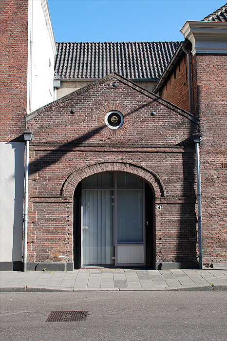 Brandspuithuisje (XIX A); in schoon metselwerk opgetrokken puntgevel met rechtgesloten dubbele deur, gemetselde cordonlijsten en hoekblokken, en rond venster in geveltop; zadeldak gedekt met blauwe Hollandse pannen. |