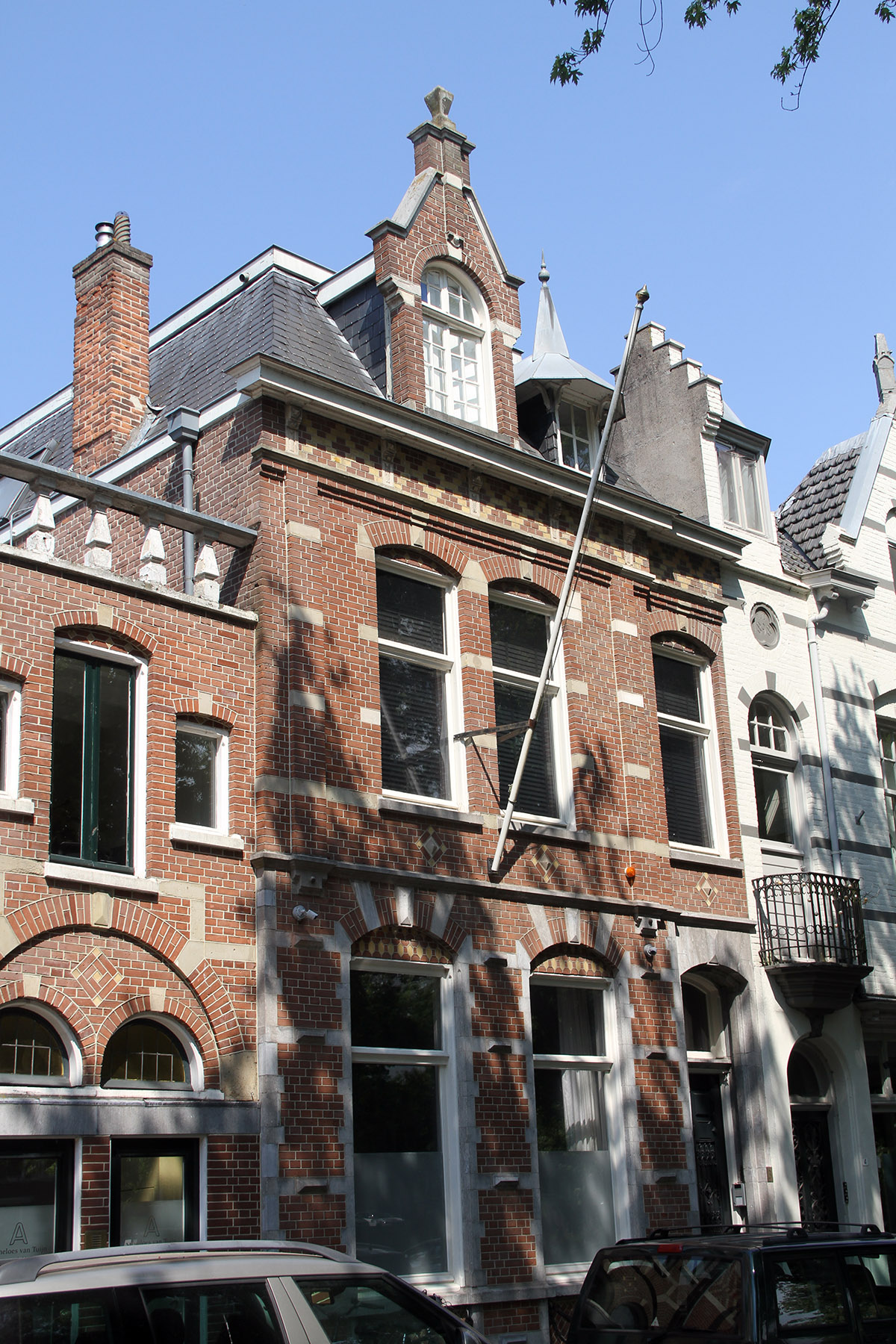 een uit siermetselwerk bestaand fries vormt de gevelbeëindiging. De ingang en vensters hebben een originele invulling, met vellingkantkozijnen en schuiframen. Alle gevelopeningen zijn gevat onder een segmentboog met sluitstenen. Met uitzondering van de ingangsportiek hebben ze een boogtrommel met siermetselwerk. Voorgevel:De asymmetrisch ingedeelde voorgevel heeft een breedte van drie vensterassen. Links bevinden zich twee vensters met aan de onderzijde een decoratief gevelpaneel. De hardstenen dagkanten markeren de tussen de gevelopeningen gelegen geveldammen. Waar de gevel ter hoogte van de rechter as licht terugwijkt bevindt zich de ingangsportiek die is opgenomen in een hardstenen gevelveld. Via een trapje leidt de portiek naar de hoofdingang, met een paneeldeur met deurraampjes met smeedijzeren sierroosters. Boven het kalf bevindt zich een enkelruits (zonder roedenverdeling) bovenlicht. Links van de portiek bevat de hier gelegen speklaag een gevelsteen met inscriptie (1898). Op de verdieping zijn er drie vensters waarvan de twee linker exemplaren zijn gekoppeld. Decoratieve geveldammen markeren hier de hoeken van het risalerende deel van de gevel. Voornoemd dakhuis ligt in het verlengde van de tussen de gekoppelde vensters gelegen dam.Zijgevels:Het pand wordt aan beide zijden begrensd door bebouwing.Achtergevel:De achtergevel is niet zichtbaar vanuit de openbare ruimte.Ruimtelijke indeling:Het pand heeft een voor herenhuizen karakteristieke klassieke indeling met een opzij gelegen gang met trappenhuis en aan één zijde daarvan gelegen hoofdvertrekken. Op de begane grond zijn deze en suite.Interieurelementen:Het is niet bekend in hoeverre er nog originele interieurelementen aanwezig zijn. Uitgaande van de verbouwingstekeningen uit 2006-2007 bleven de originele schoorsteenmantels, binnendeuren en trap behouden. Het interieur is mede beschermd voor zover het monumentale waarden omvat.Erf, bijgebouwen, diversen:N.v.t. | 4 |