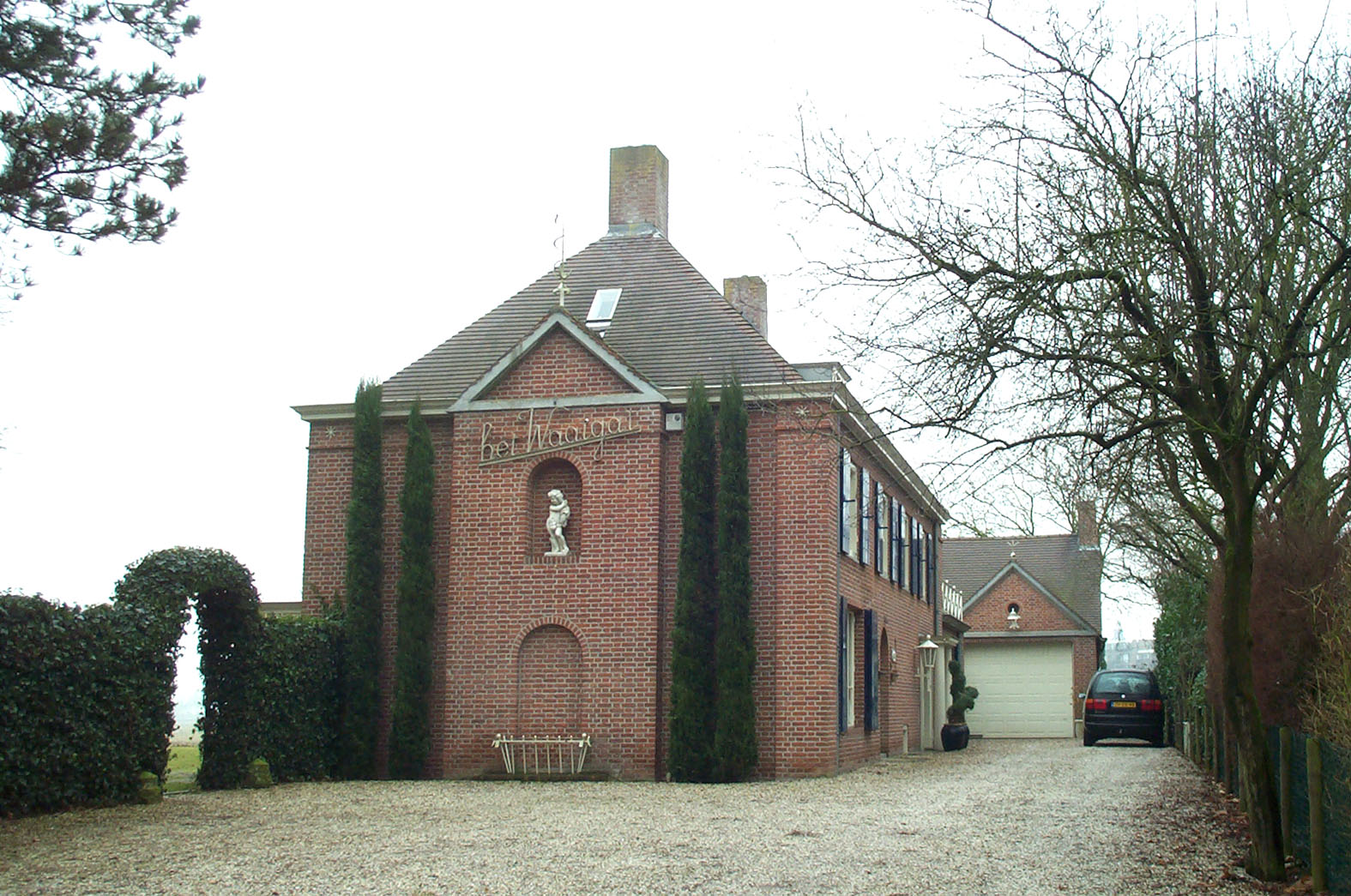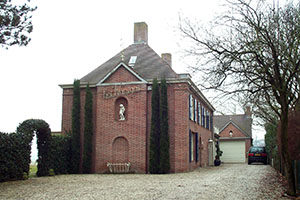 verband en met vrij grove voegen. Een in het metselwerk opgenomen hoofdgestel vormt de gevelbeëindiging. Verder zijn er gemetselde hoekpilasters, bovenin met een ijzeren siermotief. De diverse ramen zijn in staal uitgevoerd. Voorgevel:Deze op het oosten gerichte kopgevel is symmetrisch ingedeeld, met in het midden een risaliet dat wordt bekroond door een gemetseld timpaan met betonnen lijsten. In de top bevindt zich een ijzeren Asclepius-motief. Het risaliet is in beide bouwlagen verlevendigd met een blinde gevelnis, op de begane grond met een ijzeren sierhek. Beide nissen zijn gevat onder een rondboog. Hoekpilasters geleden de blinde zij-assen van de gevel.Zijgevels:De rechter zijgevel (noordkant) is asymmetrisch ingedeeld en bevat uiterst rechts de van een luifel en pilasterlijsten voorziene hoofdingang. Uiterst links bevindt zich een venster met opgeklampte luiken en rechts daarvan een rondboogingang. Op de verdieping heeft de woning vier vensters, eveneens met luiken. De vensters bevatten ramen met roedenverdeling en in het midden een klapraampje.De op de tuin gerichte linker zijgevel (zuidkant) is eveneens asymmetrisch. Hier bevindt zich uiterst rechts een later gerealiseerde erker met aan de bovenzijde een ‘Frans balkon’ met een ijzeren hekwerk. Links van de erker zijn er nog enkele gevelopeningen. Op de bovenverdieping heeft de woning vier vensters met luiken als in de rechter zijgevel. Achtergevel:Aan de achterzijde (westkant) sluit een éénlaags vleugel aan, uitkragende langs de linker zijgevel van het pand. Deze uitbouw vormt aan de bovenkant een balkon met een ijzeren hekwerk met kruiselings verdeelde spijlen en aansluitende op een hoge gemetselde schoorsteen. De vleugel is later verbonden met een veranda. | 4 |