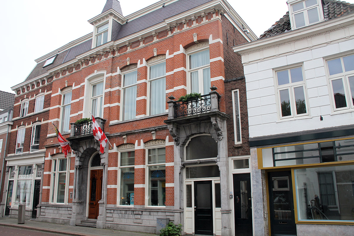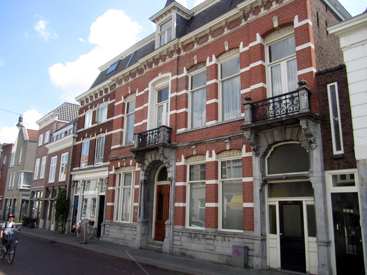 Deze in oranje-rode strengpersbakstenen opgetrokken lijstgevel (kruisverband) heeft vijf vensterassen en twee risalerende delen. Het linkerrisaliet omvat de hoofdentree van het gebouw. Deze stenen entreepartij is aan weerszijden voorzien van een basement met daarop zuilen in composiet orde. De Florentijnse boog heeft een zwaar blokmotief. De entreepartij is aan de bovenzijde voorzien van een balkon op twee zware en gedecoreerde consoles. Het ijzeren balkonhek is gevat tussen twee kunststenen hekpijlers. De oorspronkelijke, dubbele voordeur bevindt zich in een geprofileerd deurkozijn dat voorzien is van een halfrond bovenlicht. Dit bovenlicht is gesierd met een rooster van siersmeedwerk. Het geprofileerde deurkozijn is geplaatst op hardstenen neuten. Voor de deur bevindt zich een hardstenen trap met twee treden. Op eerste verdiepingsniveau is het risaliet voorzien van een gevelopening die geaccentueerd is met een stucwerk omlijsting. Het geprofileerde kozijn is voorzien van twee naar binnen draaiende balkondeuren en een glas-in-lood bovenlicht. Het rechterrisaliet is een hoekrisaliet. De entreepartij die zich in dit risaliet bevindt is eenvoudiger. De pui onder de tussendorpel is in vernieuwd. Het bovenlicht is oorspronkelijk. Het balkon boven deze entree is identiek aan het balkon boven de hoofdentree. De gevelopening op eerste verdiepingsniveau heeft een geprofileerd kozijn met twee naar binnen draaiende balkondeuren en een glas-in-lood bovenlicht. De beide vensterassen tussen de risalerende delen zijn zowel op begane grond als eerste verdiepingsniveau voorzien van een gevelopening onder een steens segmentboog. Deze segmentbogen hebben aanzetstenen en een gedecoreerde sluitsteen. Deze sluitsteen is op begane grond niveau uitgevoerd als console van de bovenliggende waterlijst. Deze waterlijst ligt in lijn met de geprofileerde balkonplaat. De geprofileerde kozijnen hebben een groot schuivend onderraam en een vast glas-in-lood bovenlicht dat aan de onderzijde geprofileerd is. De boogvulling boven het bovenlicht is voorzien van een gede-
