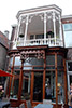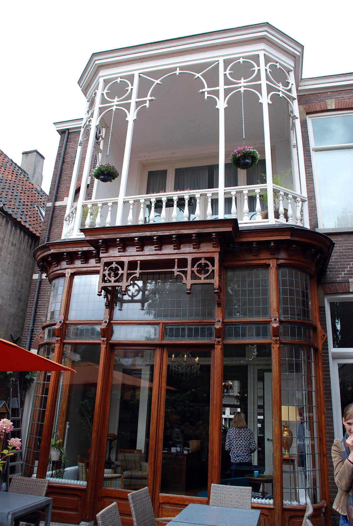 De kroonlijst is voorzien van een geprofileerde en uitstekende bakgoot die wordt gedragen door een groot aantal gedecoreerde consoles. Onder deze consoles sluit een waterlijst aan. De ruimte tussen de consoles is gevuld met siermetselwerk. Het dakschild is boven de hoofd-entree geaccentueerd met een dakkapel. De kapel heeft een T-venster, met leien gedekte zijkanten en een geprofileerde uitstekende bakgoot op consoles. De dakkapel is voorzien van een met leien gedekt, afgetopt tentdak. De dakschilden zijn aan de bovenzijde afgesloten met een geprofileerde lijst.
