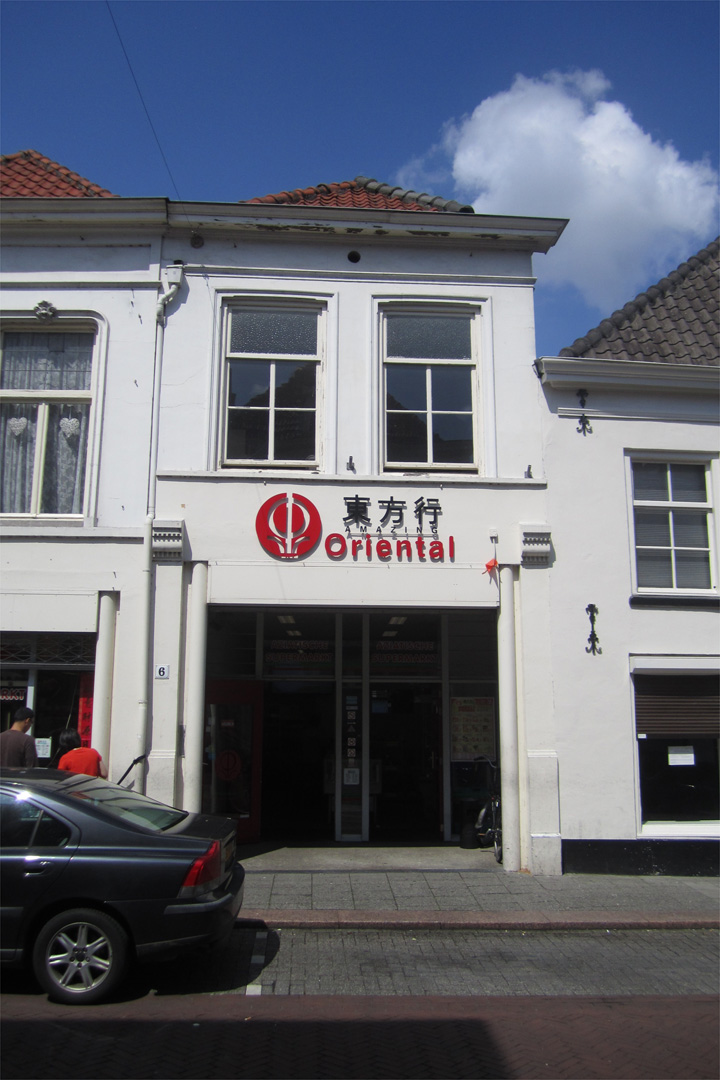 hardstenen basementen met plint en geprofileerde kapiteel-achtige elementen met tandlijstjes (alle geverfd). Daarboven zijn er op de verdieping twee vensters boven een gepleisterde cordonlijst. De vensters hebben geprofileerde omlijstingen met een licht getoogde bovenzijde. De kozijnen hebben vellingkanten en bevatten vierruits schuiframen met een enkelruits bovendeel met bobbelglas. De gevel wordt afgesloten door een classicistisch hoofdgestel met gepleisterde architraaf en fries, voorzien van een kleine oculus in het midden, en een geprofileerde houten kroonlijst. Zijgevels:Het pand wordt aan beide zijden begrensd door bebouwing. Alleen de voorste bovenhoek van de rechter zijgevel is vanaf de straat zichtbaar. Dit gedeelte is gecementeerd, en langs de bovenzijde loopt een ongeprofileerde houten lijst langs de bakgoot.Achtergevel:De achtergevel is vanuit de openbare ruimte niet zichtbaar. Op de begane grond is deze waarschijnlijk grotendeels uitgebroken ten behoeve van de grote winkelruimte.Ruimtelijke indeling:Volgens een rapport van de afdeling BAM uit 1988/1991 en een bouwtekening uit 1990 heeft het pand de volgende indeling. Rechtsachter ligt een kelder, die mogelijk in 1988 is volgestort. Op de begane grond is de indeling vrijwel geheel uitgebroken in de 20ste eeuw. Op de verdieping bevindt zich volgens de tekening uit 1990 een grote ruimte die als magazijn dient. In een tekening uit 1988 is te zien dat deze ruimte toen nog als woning diende, en werd ontsloten via een trap achterin het pand tegen de rechter zijmuur, daterend van na 1915.Constructies:Het rapport van de afdeling BAM uit 1988/1991 vermeldt de volgende zaken. De linker zijmuur is gedeeld met het buurpand. Op de begane grond is deze weggebroken en vervangen door een betonnen balk op betonnen pijlers. De rechter zijmuur is waarschijnlijk niet gedeeld met het buurpand. De kelder heeft een tongewelf dat boven het maaiveld uitsteekt, haaks op de voorgevel, en een kelderlicht in de achtergevel. De kelder is van binnenuit via een trap toegankelijk. Het pand bevat een samengestelde verdiepingsbalklaag met peerkraalsleutelstukken en restanten van een houtskelet. De zolderbalklaag is enkelvoudig en de kap heeft schaarspanten met trekplaten.Interieurelementen:Over de interieurelementen is geen documentatie voorhanden.Erf, bijgebouwen, diversen: | 3 |