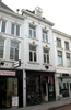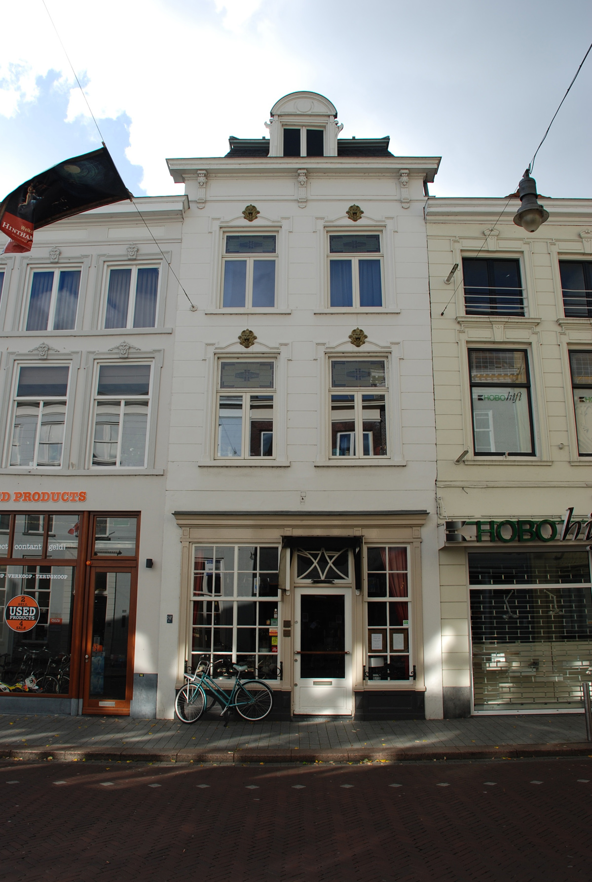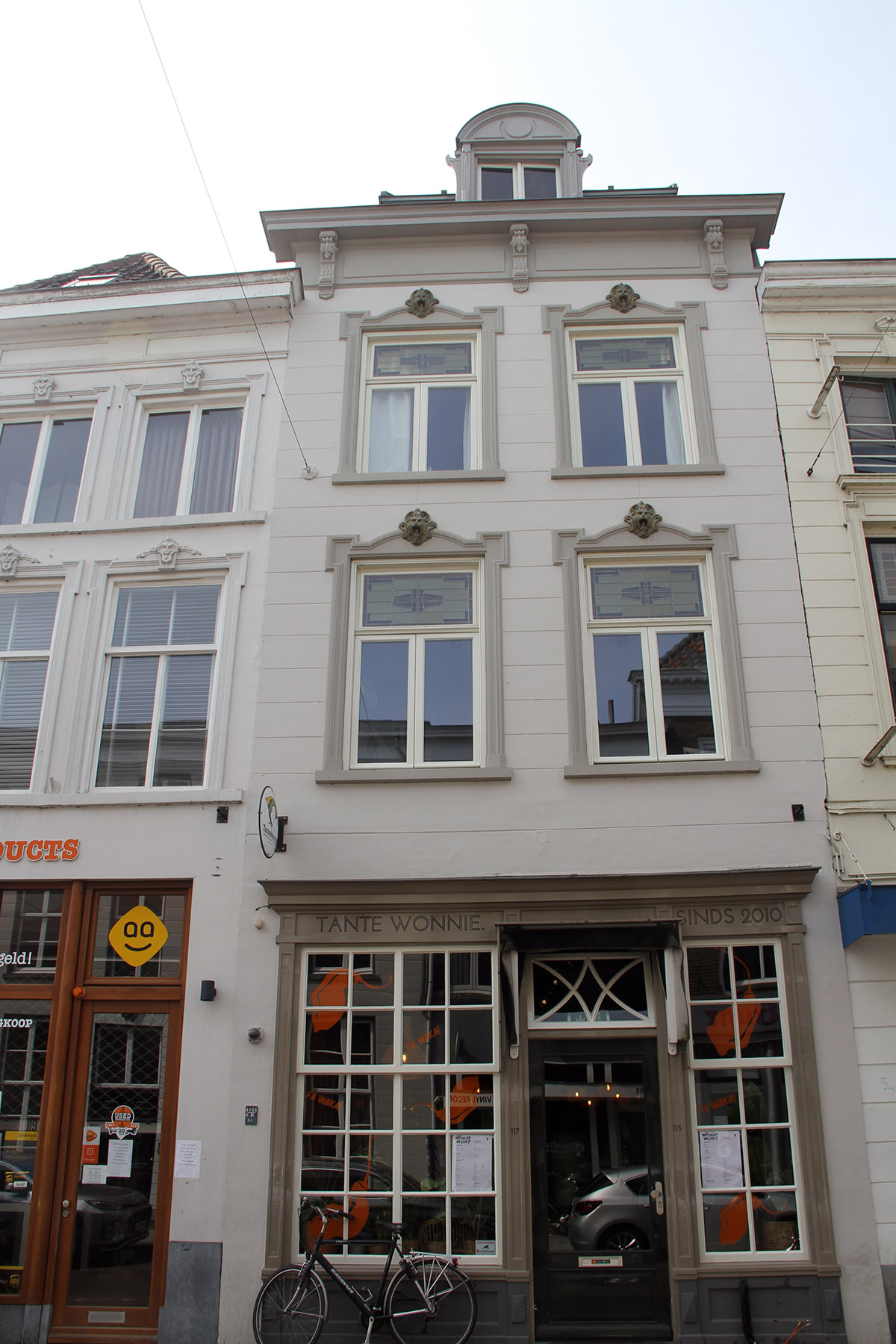 Context(Bouw)historie:Het pand Hinthamerstraat 115-117, vanouds genaamd "de Vergulde Trom", dateert in kern uit de 15de eeuw. Vermoedelijk is het pand tegelijk met het buurpand nr.113 verbouwd, waarbij houtskeletten tegen de gemeenschappelijke tussenmuur werden gebouwd. Rond 1880 is de voorgevel verbouwd tot gepleisterde lijstgevel, en werd op het voorste deel van het pand een mansardekap gezet. In 1956-'57 werd de begane grond verbouwd, waarbij een grote ruimte ontstond, en in 1974 is de indeling op de verdiepingen gewijzigd, toen er op de eerste verdieping een restaurant-ruimte werd gecreëerd. In 1980 is de pui vernieuwd in historiserende stijl.Ligging:Het pand is gelegen aan de zuidzijde van de Hinthamerstraat in een gesloten gevelwand. De Hinthamerstraat is al sinds de late 12de eeuw een van de drie belangrijke straten die het centrum van de stad (de Markt) met het omliggende gebied verbinden. Bij de stadsuitbreiding in de eerste helft van de 14de eeuw kwam de Hinthamerstraat binnen de stadsmuren te liggen.Het langwerpig perceel liep van oorsprong ongetwijfeld verder door naar achter en omvatte waarschijnlijk ook Sint Janskerkhof 7b. Later is het perceel echter opgedeeld. Wanneer dit gebeurde is niet duidelijk; de kadastrale kaart van 1823 biedt geen goed beeld daarvan. Aan de achterzijde van het pand ligt een kleine plaats met twee eenlaags bouwdelen met platte daken. Daarachter ligt het bebouwde perceel Sint Janskerkhof 7b. BeschrijvingAlgemeen (hoofdvorm, kap):Het pand is gebouwd op een langwerpige rechthoekige plattegrond. Het bestaat uit een voorhuis met vast achterhuis. Het gebouw heeft een hoge begane grond die in het achterhuis onderkelderd is, een verdieping en een zolder met borstwering. Op het voorste deel van het pand is in de late 19de eeuw een nieuw vierzijdig mansardedak gezet, dat (secondair) is gedekt met mastiek en mastiekleien. Aan de voorzijde staat in het midden een dakkapel. Daarachter bevindt zich nog het oude zadeldak, met aan de achterkant een wolfseinde, dat is gedekt met rode Hollandse pannen. Aan beide zijden zijn er kleine dakkapellen.Voorgevel:De voorgevel is een symmetrische gepleisterde lijstgevel van rond 1880 met op de hoge begane grond een houten pui uit 1980. Deze pui is een imitatie van een mid-19de-eeuwse winkelpui. Ter weerszijden van de pui zijn er gepleisterde penanten, Het pleisterwerk boven de pui is voorzien van horizontale schijnvoegen. Op de eerste en tweede verdieping zijn er twee vensters met gepleisterde lekdorpels en geprofileerde omlijstingen met uitgezette schouders en in de getoogde bovenzijde een leeuwenkopje met sierstucwerk. De kozijnen hebben een kraalprofiel en de T-stolpramen bevatten glas-in-lood in de bovenlichten. De gevel wordt afgesloten door een classicistisch hoofdgestel met een gepleisterd fries met drie trigliefen die overgaan in consoles met acanthusblad die de geprofileerde houten kroonlijst dragen. Op het voorschild van het dak staat een houten dakkapel met plat dak en een decoratieve voorzijde met geprofileerde stijlen met uitgezette schouders en een gebogen fronton met een cirkelmotief in het centrum. Het venster is dichtgeplaat.Zijgevels:Het pand wordt aan beide zijden begrensd door bebouwing. | 1 |