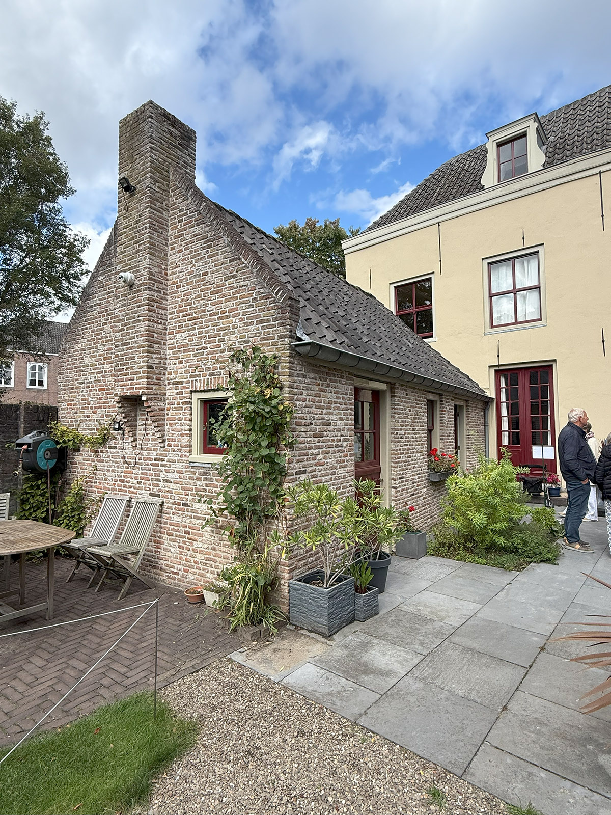 Een gang met marmeren lambrisering leidt via een overkapte binnenplaats met groot tegeltableau naar de langs de Binnendieze gelegen tuin. Rond 1500 waren hier de alexianen of cellebroeders gevestigd. In feite is sprake van twee samengevoegde panden, beide onderverdeeld in een traditioneel type voor- en achterhuis.