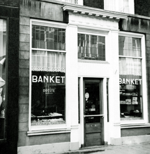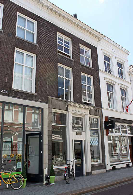 Dit pand dateert uit de late middeleeuwen en behoort tot het traditionele type, met een voor- en achterhuis. De constructies binnen het pand zijn te herleiden tot de 15e, 17e en 19e eeuw. De voorgevel dateert uit de late 18e of vroege 19e eeuw en heeft de voor de 19e eeuw typerende schuifvensters in empirestijl. Het winkelinterieur dateert uit dezelfde periode en is verrassend gaaf gebleven. Zo is de vroeg-19e-eeuwse houten binnenpui voorzien van houten profielen en zogeheten waaierzwikken.