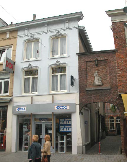 Context(Bouw)historie:Het pand Hinthamerstraat 21, vanouds genaamd "de Sprinkhaan", bevat een winkel op de begane grond en een woning op de verdiepingen. Het gebouw bestaat uit een voorhuis met een vast achterhuis waaronder een kelder ligt. Het dateert in kern waarschijnlijk uit de periode van de 15de-17de eeuw, maar waarschijnlijk is het ergens in de 18de eeuw met een bouwlaag opgehoogd. Rond 1860 is de voorgevel verbouwd tot de huidige staat (althans, boven de begane grond). In de vroege 20ste eeuw werd er een nieuwe winkelpui gebouwd en in de tweede helft van de 20ste eeuw werd deze enkele malen gemoderniseerd. In 2002 is de onderverdeling in de kelder, die onder het achterhuis gelegen is, verwijderd, en is een nieuwe keldertrap rechts achterin het pand geplaatst. Tevens werd het linkerdeel van de dwarsmuur op de begane grond verwijderd.Ligging:Het pand is gelegen aan de zuidzijde van de Hinthamerstraat op de oostelijke hoek met de Sint Annaplaats. De Hinthamerstraat is al sinds de late 12de eeuw een van de drie belangrijke straten die het centrum van de stad (de Markt) met het omliggende gebied verbinden. De straat loopt vanaf de Markt oostwaarts om verderop naar het noorden te knikken.Het onderhavige gedeelte van de Hinthamerstraat ligt net buiten de oudste omwalling van de stad, die uit de eerste helft van de 13de eeuw dateert. De poort in de Hinthamerstraat (de Leuvense- of Gevangenenpoort) stond tot in de vroege 19de eeuw net ten noordwesten van de locatie van het onderhavige pand. Bij de stadsuitbreiding in de eerste helft van de 14de eeuw kwam ook het meer oostelijke gedeelte van de straat binnen de stadsmuren te liggen. De Sint Annaplaats vormde van oorsprong de toegang tot het achter de bebouwing aan de Hinthamerstraat gelegen Grootziekengasthuis. In 1458 verhuisde dit gasthuis, maar sindsdien vormt de plaats nog de toegang tot andere percelen. Het onderhavige perceel behoorde in de 14de eeuw ook tot het gasthuis. Tussen het onderhavige pand en het linker buurpand lag tot in de 19de eeuw een osendrup, maar bij een verbouwing is deze volgebouwd ter uitbreiding van beide panden. Achter het huis is er een zeer kleine ommuurde achterplaats, en daarachter ligt de Sint Annaplaats, die L-vormig is. De rechter achterhoek van het perceel heeft een afgeronde vorm. BeschrijvingAlgemeen (hoofdvorm, kap):Het pand bestaat uit een voorhuis met een vast achterhuis, op een langwerpig rechthoekige plattegrond. Het achterhuis is iets smaller dan het voorhuis. Onder het achterhuis ligt een kelder, waarvan de houten zoldering boven het maaiveld ligt. Het pand bevat een hoge begane grond, twee verdiepingen en een zolder met een lage borstwering. Het zadeldak met voor- en achterschild is gedekt met rode muldenpannen. In het achterschild staat een kleine houten dakkapel met een pannengedekt lessenaarsdakje en een dubbel draairaam, waarschijnlijk daterend uit de vroege 20ste eeuw. In het rechter dakschild bevindt zich ongeveer halverwege de diepte van het pand een legraam in het dakvlak. | 2 |