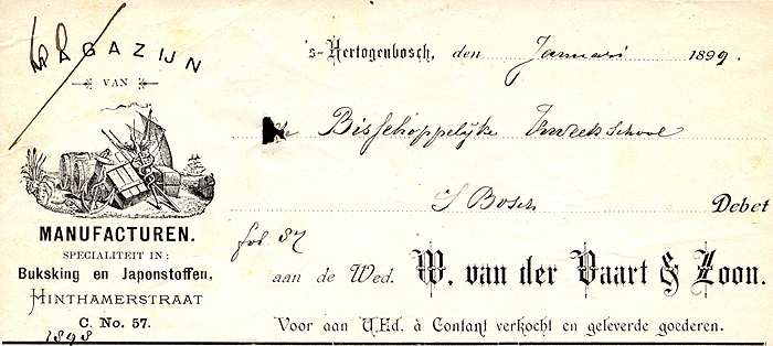 c. | Maria Jacoba Lightenvelt, gedoopt in het bedehuis van St. Jan te den Bosch 1 Juli 1806; zij erfde het huis de Gulden Zon of de Zon van hare ouders en bracht het ten huwelijk aan haren echtgenoot Joannes Petrus van Kemenade; 6 Juli 1833 overleed zij kinderloos te den Bosch, waarna haar man hertrouwde met Margaretha Maria Gast; hij stierf vóór deze te den Bosch 13 September 1880 na aan haar het aandeel in dit huis, voor zooverre hij het niet aan haar betrouwd had, vermaakt te hebben; zij overleed kinderloos te den Bosch 22 December 1891, waarop hare erfgenamen dit huis in 1892 verkochten aan Johannes Hubertus Antonius Ignatius van der Vaart, die er een handel in manufacturen in vestigde. |