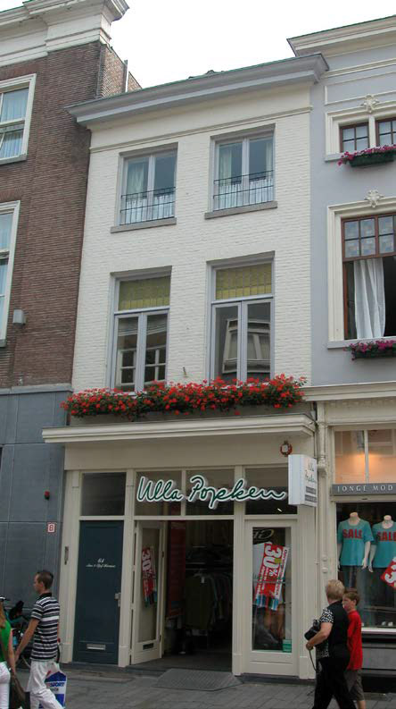 gepleisterde architraaf en dito fries, en een houten kroonlijst. Getuige een foto uit het archief van de afdeling BAM uit 1997 bevat de voorgevel van het voorheen losse achterhuisje op de verdieping twee vensters met zesruits schuiframen. De gevel wordt afgesloten door een eenvoudige gootlijst. Zijgevels:Het pand wordt begrensd door de naburige panden, en dus zijn de zijgevels vanuit de openbare ruimte niet zichtbaar.Achtergevel:De achtergevel van het pand is vanuit de openbare ruimte niet zichtbaar. Volgens een documentatie-rapport van de afdeling BAM uit 1981 is de achtergevel een gepleisterde topgevel. Op de begane grond is deze weggebroken. Op de verdieping zijn er twee vensters en in de top is er een kleiner venster.Ruimtelijke indeling:Volgens bouwtekeningen uit 1996 en 2005 is de indeling als volgt. Onder het voorhuis ligt de oude kelder, die toegankelijk is via een luik en een bakstenen trap net achter de plek waar de brandmuur oorspronkelijk stond en via een trap links voorin, die naar de straat leidt. Onder het achterste deel van het perceel ligt een recente kelder, die doorloopt onder het rechter buurpand. De begane grond wordt vrijwel geheel ingenomen door de winkel, die via grote doorgangen in de zijmuur doorloopt in het rechter buurpand. Achterin ligt een afgescheiden magazijn, en links voorin is een aparte opgang naar de bovenwoning. Op de verdieping ligt achter de grote voorkamer een gang tegen de rechter zijmuur, met achter de brandmuur een trappenhuis met bordestrap naar de zolder. Ook op zolder is er een dergelijke indeling, waarbij de voorste ruimte nog is onderverdeeld door een muur ter plekke van de sprong in de kaphoogte.Constructies:Volgens een documentatie-rapport van de afdeling BAM uit 1981 zijn de volgende constructies in het pand aanwezig. De oude kelder onder het voorhuis heeft een gedrukt tongewelf in langsrichting met aan weerszijden vier steekgewelven. De verdiepings- en zolderbalklaag zijn samengesteld uit moer- en kinderbinten. De kap heeft grenen dekbalkjukken met trekspanten, daterend uit de tweede helft van de 19de eeuw.Getuige bijschriften bij foto’s in het archief van de afdeling BAM uit 1997, bevatte de rechter zijmuur 14de-eeuws muurwerk. Deze muur is echter grotendeels gesloopt voor de doorgangen in de vergrote winkelruimte. Deze zijmuur was een gemeenschappelijke muur. Hoogstwaarschijnlijk geldt dat ook voor de linker zijmuur. Interieurelementen:Volgens het documentatie-rapport van de afdeling BAM uit 1981 dateert de bordestrap tussen de verdieping en de zolder uit de late 19de of vroege 20ste eeuw.Erf, bijgebouwen, diversen:Het perceel is geheel bebouwd. | 3 |