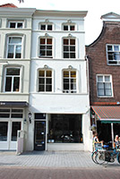 Context(Bouw)historie:Het pand Hinthamerstraat 80, vanouds genaamd "de Vier Sterren", dateert getuige de hoge begane grond in kern uit de late middeleeuwen en is sterk verbouwd rond 1860. Onder het achterste deel van het pand ligt een oude kelder. Het gebouw vormt heden ten dage één geheel, maar blijkens de indeling van de kelder was er vroeger een indeling in een voor- en een achterhuis.Volgens een bouwtekening uit 1914 werd de voorkamer op de begane grond destijds tot winkel verbouwd, waarbij een groot etalageraam twee kleinere ramen verving en het voorste deel van de gang tegen de linker zijmuur verdween. In 1962 werd de pui gewijzigd en is de winkel naar achter uitgebreid. In die tijd was er een slagerij in het pand gevestigd. Achter het huis lag een kleine plaats met daarachter een klein gebouwtje. Dit is al aangegeven in de kadastrale kaart van 1823. Eind 20ste eeuw werd de plaats bebouwd met een eenlaags volume, en in 2002 werd het dwarse zadeldakje van het kleine eenlaags gebouwtje vervangen door een plat dak. Ook is de wenteltrap uit de tweede helft van de 19de eeuw vervangen door steektrappen. Ligging:Het pand is gelegen aan de noordzijde van de Hinthamerstraat in een gesloten gevelwand tussen de straatjes In den Boerenmouw en de Zusters van Orthenpoort. De Hinthamerstraat is al sinds de late 12de eeuw een van de drie belangrijke straten die het centrum van de stad (de Markt) met het omliggende gebied verbinden. Bij de stadsuitbreiding in de eerste helft van de 14de eeuw kwam de Hinthamerstraat binnen de stadsmuren te liggen. Een deel van de straat zal echter al eerder bebouwd zijn geweest, en mogelijk geldt dat ook voor het onderhavige perceel.Tegenover het pand ligt het kerkhof en de beeldbepalende noordelijke transeptarm van de St. Janskerk. Achter de aanbouwen achterop het perceel ligt het bebouwde perceel In den Boerenmouw 5. BeschrijvingAlgemeen (hoofdvorm, kap):Het pand is gebouwd op een langwerpige min of meer rechthoekige plattegrond die taps toe loopt naar achteren. Het gebouw omvat een kelder, een hoge begane grond, twee verdiepingen en een zolder met borstwering onder een zadeldak met voor- en achterschild. Dit dak is gedekt met gesmoorde opnieuw verbeterde Hollandse pannen en bijbehorende nokvorsen.Voorgevel:De voorgevel is grotendeels symmetrisch. Het betreft een gepleisterde lijstgevel daterend uit omstreeks 1865. De bouwlagen worden in de voorgevel gescheiden door drie cordonlijsten. Op de hoge begane grond is er tussen smalle penanten een grote gevelopening uit 1962 met een groot etalageraam met een messing kozijn en links daarvan de ingang met houten deur en bovenlicht uit de tweede helft van de 20ste eeuw. Op de verdiepingen zijn er steeds twee vensters met gepleisterde profileringen er omheen met afgeronde bovenhoeken en a-symmetrische kuiven. De kozijnen hebben een kwarthol profiel en dateren net als de ramen uit de bouwtijd van de gevel. Op de eerste en tweede verdieping zijn er hoge vensters met zesruits schuiframen. De derde verdieping heeft het karakter van een mezzanino, met twee lage vensters met stolpramen. De gevel wordt afgesloten door een classicistisch hoofdgestel met een gepleisterde architraaf en fries, en een geprofileerde houten kroonlijst.Zijgevels: | 2 |