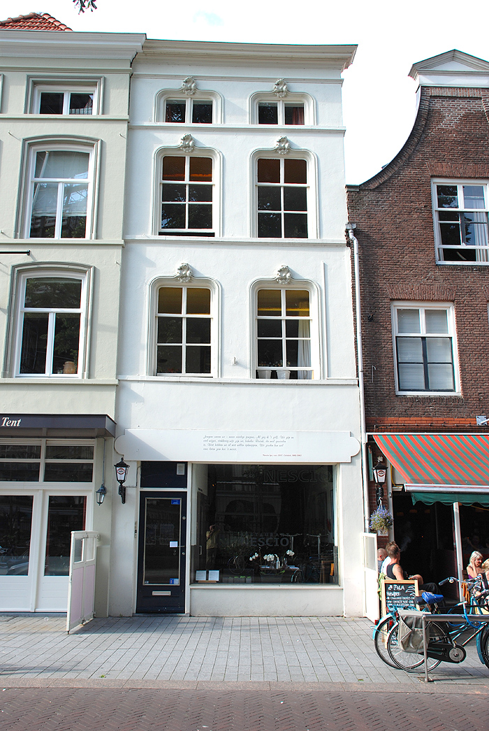 te zien omdat het boven het buurpand uitsteekt. Het muurwerk is mogelijk uitgevoerd met hergebruikte bakstenen. In het achterhuis zijn in 2003 door de afdeling BAM kleine delen van het muurwerk van de zijgevels bekeken, waarbij deze (laat) 19de-eeuws bleken te zijn (de linker in machinale steen). Achtergevel:De achtergevel is niet zichtbaar vanuit de openbare ruimte. Volgens bouwtekeningen is de oude achtergevel op de begane grond grotendeels opengebroken.Ruimtelijke indeling:Het pand is één geheel, maar blijkens de plaats van de kelder onder het achterste deel van het pand is er wel een verdeling geweest in voor- en achterhuis. Blijkens een bouwtekening uit 1997 was de indeling als volgt. Op de begane grond is er een ruime voorkamer met daarachter een gang tegen de linker zijmuur. Rechts van die gang ligt een grote achterkamer (keuken, doorlopend in de eenlaags aanbouw met plat dak op de vm. binnenplaats) Tussen de voor- en de achterkamer bevinden zich nog restanten van een spilloze wenteltrap (Engelse trap) ongeveer halverwege de diepte van het pand, met rechts daarnaast een kleine tussenkamer (koelcel). Voor en achter deze tussenkamer zijn er forse tussenmuren. Een moderne steektrap heeft de functie van de oude trap overgenomen.Op de verdiepingen ligt er steeds een gangetje tegen de westelijke zijmuur, en zijn er dunne tussenwanden die de ruimtes verdelen in een voor- en achterkamer met kleine ruimtes ertussen. Constructies:Bij waarnemingen door de afdeling BAM in 1995 en 2003 zijn de volgende zaken in het interieur van het pand vastgesteld.De kelder onder het achterste deel van het pand heeft een tongewelf in de lengterichting van het pand, met aan de voorzijde een half tongewelf dwars daarop. In de voor- en de achterkamers zijn er rookkanalen tegen de rechter (oostelijke) zijmuur. De balklagen zijn alle enkelvoudig. In het achterhuis hebben de balken van de eerste verdiepingsvloer een kwart ronde profilering. De eerste verdiepingsvloer in het voorhuis heeft een recente balklaag. De kap rust op bijzondere spanten met een halfronde vorm gemaakt van aan elkaar geboute kromme balken (Philibertspant) waartegen de gordingen zijn afgesteund, maar met makelaars naar de nokgording. Interieurelementen:De keldervloer is gedekt met rode plavuizen. Aan de achterzijde bevindt zich een dichtgezet kelderlicht, en in de noordwestelijke hoek is er nog een kolenbak.In het achterhuis zijn er op de begane grond in de twee achter elkaar liggende kamers stucplafonds, waarbij het achterste is voorzien van lijstwerk en een centraal ornament. Ook boven de gang en in beide kamers op de eerste verdieping en in de voorkamer op de tweede verdieping zijn er stucplafonds met lijsten en ornamenten. De stucplafonds dateren uit de tweede helft van de 19de eeuw. Dit geldt ook voor de raamomtimmeringen op de eerste en tweede verdieping aan de voorzijde. Deze omtimmering is vooral rijk uitgevoerd in de voorkamer op de eerste verdieping, en dat geldt ook voor het plafond aldaar. Erf, bijgebouwen, diversen:De voormalige plaats is tussen 1995 en 1997 bebouwd met een eenlaags aanbouw met plat dak. Daarachter staat een klein eenlaags bouwvolume (19de-eeuws?) waarvan in 2002 de kap is vervangen door een plat dak. | 3 |