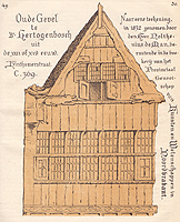 De oude, houten gevel, die op blz. 49 is afgebeeld, heeft gestaan te 's-Hertogenbosch in de Hinthamerstraat, links naast het gebouw van de Ill. Vrouwen Broederschap. Het huis werd, tijdens het werd afgebeeld, bewoond door den messenmaker Verreijt.