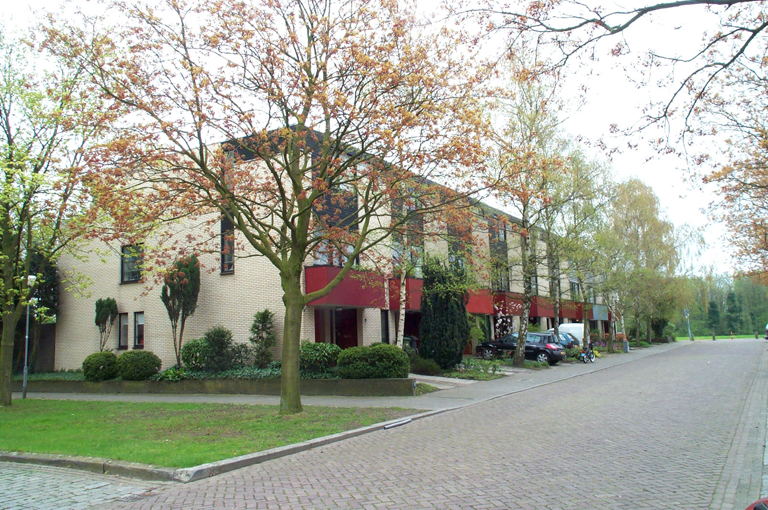 Aaneengesloten bouwblok van drive-in woningen, bestaande uit begane grond en twee bouwlagen. Elke woning heeft twee traveeën, parterre bestaande uit de toegangspartij en de toegang tot de inpandige garage. In de beide volgende bouwlagen bevinden zich aaneengesloten pui-kozijnen. In de eerste bouwlaag bestaat de indeling van de pui uit een groot venster met toegangsdeur tot het balkon (boven de toegang tot de garage), in de tweede bouwlaag uit een groot samengesteld venster. De borstwering van de balkons is uitgevoerd in plaatwerk. De borstweringen in de pui-kozijnen zijn van houten delen, die ook zijn terug te vinden in de daklijst van de platte daken. Aan de achterzijde is de tweede bouwlaag voorzien van een langs de gehele achtergevel doorlopend balkon. Hier heeft het plat dak een brede overstek voorzien van dezelfde houten boorden als aan de voorzijde. De toegepaste baksteen is geel van kleur. Aan de achtergevel is zwarte mangaansteen verwerkt.