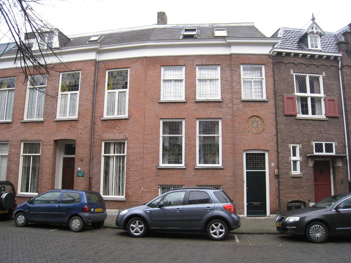 bovenlicht met eenvoudig glas-in-lood. Boven de ingang bevindt zich een oculus met stermotief in kleurig metselmozaïek, omgeving door een rollaag. De vensters hebben alle anderhalfsteens strekken en kozijnen met een kraalprofiel. De twee souterrainvensters hebben stolpramen en smeedijzeren diefijzers, de hierboven gelegen woonkamervensters zijn voorzien van enkelruits schuiframen met eenvoudige glas-in-loodpanelen. In de bovenste bouwlaag bevinden zich drie vensters met T-schuiframen, die geheel met glas-in-lood zijn gevuld. Zijgevels:Het pand wordt aan beide zijden begrensd door bebouwing.Achtergevel:De achtergevel is niet zichtbaar vanuit de openbare ruimte.Ruimtelijke indeling:Het pand heeft de voor herenhuizen gebruikelijke indeling met een zijgang (langs de oostelijke zijgevel), geflankeerd door woonvertrekken (oorspronkelijk en-suite) langs de andere zijgevel. In de gang overbrugt een trap het hoogteverschil tussen vestibule en de bel-etage.Interieurelementen:Over eventuele waardevolle interieurelementen is geen documentatie voorhanden.Erf, bijgebouwen, diversen:N.v.t. | 3 |