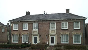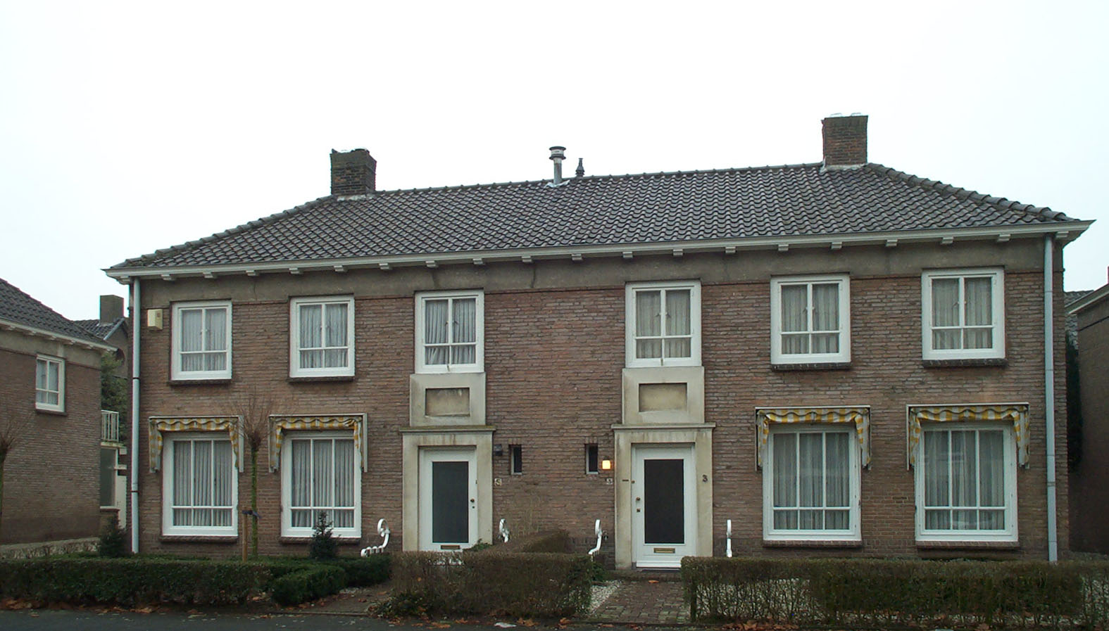 Twee gespiegelde woningen onder een kap. Dit ensemble is nog zo goed als in originele staat. Compleet met de stalen ramen in alle bouwlagen en in sschoon metselwerk. De voordeurpartijen zijn gelijkvormig uitgevoerd met een brede omlijsting in natuursteen. In hetzelfde materiaal zijn twee cassetten uitgevoerd die zich boven de voordeuren bevinden. Het schilddak heeft een brede overstek van de bakgoot met klossen. De dekking bestaat uit grauwe Verbeterde Hollands pannen.