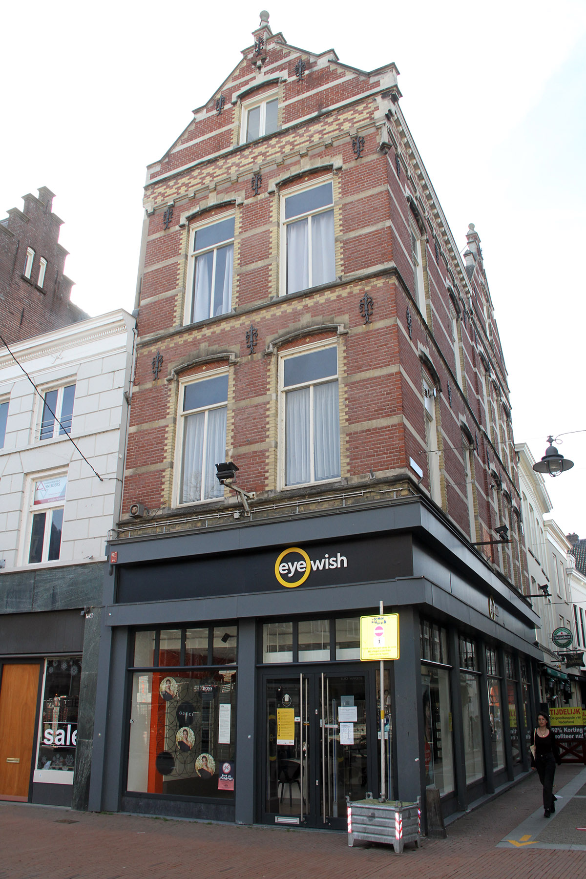 Context(Bouw)historie:Het hoekpand Kerkstraat 29-Krullartstraat 2 werd vanouds "den Ossenkop" genoemd. De oude gevelsteen met deze naam is nog behouden, en wordt bewaard bij het Genootschap voor Kunst en Wetenschap. Het huidige winkel/woonpand is rond 1900 nieuw opgetrokken. Waarschijnlijk werd hierbij wel gebruik gemaakt van oude gemeenschappelijke zijmuren (de linker zijmuur aan de Kerkstraat en de rechter zijmuur aan de Krullartstraat). In 1969 is de pui van de voor- en de zijgevel gewijzigd, met extra etalagevensters en een woningingang in de zijgevel die naar rechts werd verplaatst. In verband hiermee werd ook de trap naar de verdieping verplaatst naar achterin het pand. In 1976 is de kelder vergroot, uitgediept en van een nieuw kelderdek voorzien. Achterin het pand werd een tussenverdieping aangebracht ten behoeve van kantoorruimte, en erboven werd de verdiepingsvloer iets opgehoogd. In 2001 is de pui gewijzigd. Ligging: Het pand is gelegen aan de zuidwestzijde van de Kerkstraat op de zuidoostelijke hoek met de Krullartstraat. De voorgevel is gericht op de Kerkstraat, waar aan de overkant het voorplein van de Grote Kerk (vm. NH kerk), ligt; de lange zijgevel ligt aan de smalle Krullartstraat die duidelijk van secundair belang is ten opzichte van de Kerkstraat. De Kerkstraat verbindt vanouds de Markt met de Sint-Janskerk, vandaar de naam. De straat is voor het eerst vermeld in 1311. Bij de stadsuitbreiding in de eerste helft van de 14de eeuw kwamen de gehele straat en de kerk binnen de stadsmuren te liggen. De Krullartstraat is ontstaan na de ontmanteling van de eerste stadsmuur in de eerste helft van de 14de eeuw. Aan de buitenzijde van de muur, werden na demping van de stadsgracht percelen uitgegeven. De Krullartstraat werd waarschijnlijk langs de buitenzijde van de voormalige stadsgracht aangelegd. De naam is waarschijnlijk afkomstig van de achternaam van een van de twee families die in de 14de eeuw (Crullen) of de 15de eeuw (Crullaert) op de hoek met de Kerkstraat woonden. Het voorplein van de Grote Kerk is gecreëerd in 1822-'23. In deze jaren moest de bestaande bebouwing aan de noordoostzijde van de Kerkstraat tot aan de Hinthamerstraat wijken voor de bouw van deze kerk en de aanleg van een voorplein. Het perceel van Kerkstraat 29 - Krullartstraat 2 is geheel bebouwd met het huis. Zowel aan de Kerkstraat als aan de Krullartstraat grenst het huis direct aan buurpanden. BeschrijvingAlgemeen (hoofdvorm, kap):Het pand heeft een langwerpig rechthoekige plattegrond. Het bevat een kelder, een hoge begane grond met achterin een recente insteekverdieping, twee vrij hoge verdiepingen en een zolder met borstwering. De kap is samengesteld uit twee zadeldaken die in T-vorm op elkaar aansluiten. Op het voorste deel van het pand staat de nok haaks op de voorgevel en is de dakhelling vrij steil; op het achterste deel loopt de nok evenwijdig aan de voorgevel en is de dakhelling minder steil. Het dak is gedekt met gesmoorde kruispannen. In het rechter dakvlak op het voorste gedeelte van het pand staan twee houten dakkapellen met zinken zadeldakjes, en in het linker dakvlak alsmede in het achterste dakvlak bevinden zich recente dakramen. | 2 |