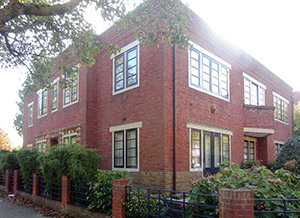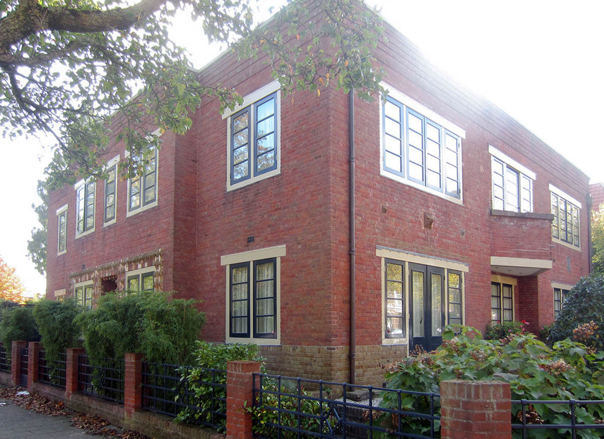 De tuin van het pand wordt omringd door een bakstenen muur met smeedijzeren hekwerk.
