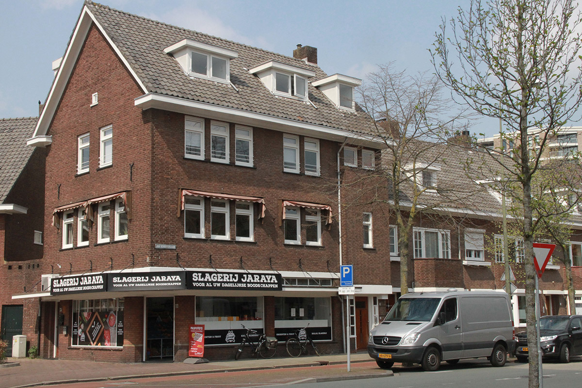 Het hoekpand Kapelaan Koopmansplein 115-117 staat op de hoek met de Jan Schöfferlaan. Het pand vormt de verbinding tussen de gevelwanden van het plein en de straat. Het is gebouwd rond 1930, naar een ontwerp van de architect J. van den Berg. Het gebouw omvat een begane grond, eerste en tweede verdieping en een zolder onder een zadeldak. De gevelrij van het plein heeft een knik tussen het hoekpand (nr. 115-117) en de andere panden aan het plein (nr. 119 t/m 125). Sinds oktober 2003 staat het geregistreerd als gemeentelijk monument. De voorgevel aan het Kapelaan Koopmansplein heeft twee gevelopeningen. Die aan de linkerkant is een deur die toegang verschaft tot de verdiepingen. Deze deur is verdiept in de pui aangebracht en heeft een betonnen onderdorpel, bovenin de deur zit glas-in-lood. Naast de deur is een grote winkelruit die aansluit op het metselwerk van de ingang in de afgeschuinde hoek. De ingang op de hoek is geaccentueerd door twee bakstenen zuilen, die staan op hoekige, bakstenen basementen. De overgang van het basement is gemarkeerd door een laag gele bakstenen. Tussen de deuren bevindt zich een metalen pui met grote ruitvlakken en keramische raamdorpelstenen. De topgevel heeft op de eerste verdieping vier en op de tweede verdieping twee vensters. In de geveltop is een klein vierkant venster aanwezig met een houten raamdorpel. In de borstwering boven de eerste verdieping zijn twee Y-vormige gevelankers aangebracht. De grote, uitkragende, houten bakgoten zijn vanuit de langsgevels iets doorgezet op de kopgevels. In de pui aan de Jan Schöfferlaan bevinden zich twee grote winkelruiten met keramische raamdorpelstenen, uiterst rechts is een verdiept in de gevel aangebrachte deur met betonnen drempel en glas-in-lood. Aan ieder zijde ervan zit een hoog en smal kozijn met vast venster, dat in vier ruitvlakken is verdeeld. Boven de deur is een uitkragende, betonnen latei aangebracht die het uitgemetselde deel van de twee bovenliggende etages draagt. Over de lengte van beide gevels is een grote, ver uitkragende luifel aanwezig die opgehangen is aan ijzeren beugels. Boven de luifel zijn met glas-in-lood gevulde bovenlichten aanwezig. Op de eerste en tweede verdieping bevat de gevel ieder vijf vensters, tot het uitspringende deel. De vensters hebben hetzelfde uiterlijk als in de kopgevel. In het uitspringende geveldeel bevindt zich op de eerste etage een venster met een draai- en klepraam. Iets onder de dakgoot springt het metselwerk in, zodat het weer aansluit op het overige metselwerk van de gevel. In dit kleine deel zijn twee kleppende vensters aanwezig. Op de overgang van gevel naar dakvlak is een ver buiten het gevelvlak uitkragende, houten bakgoot aangebracht. Het dakvlak bevat drie dakkapellen, twee met twee draairamen en een met een draairaam. De dakkapellen hebben platte daken. |