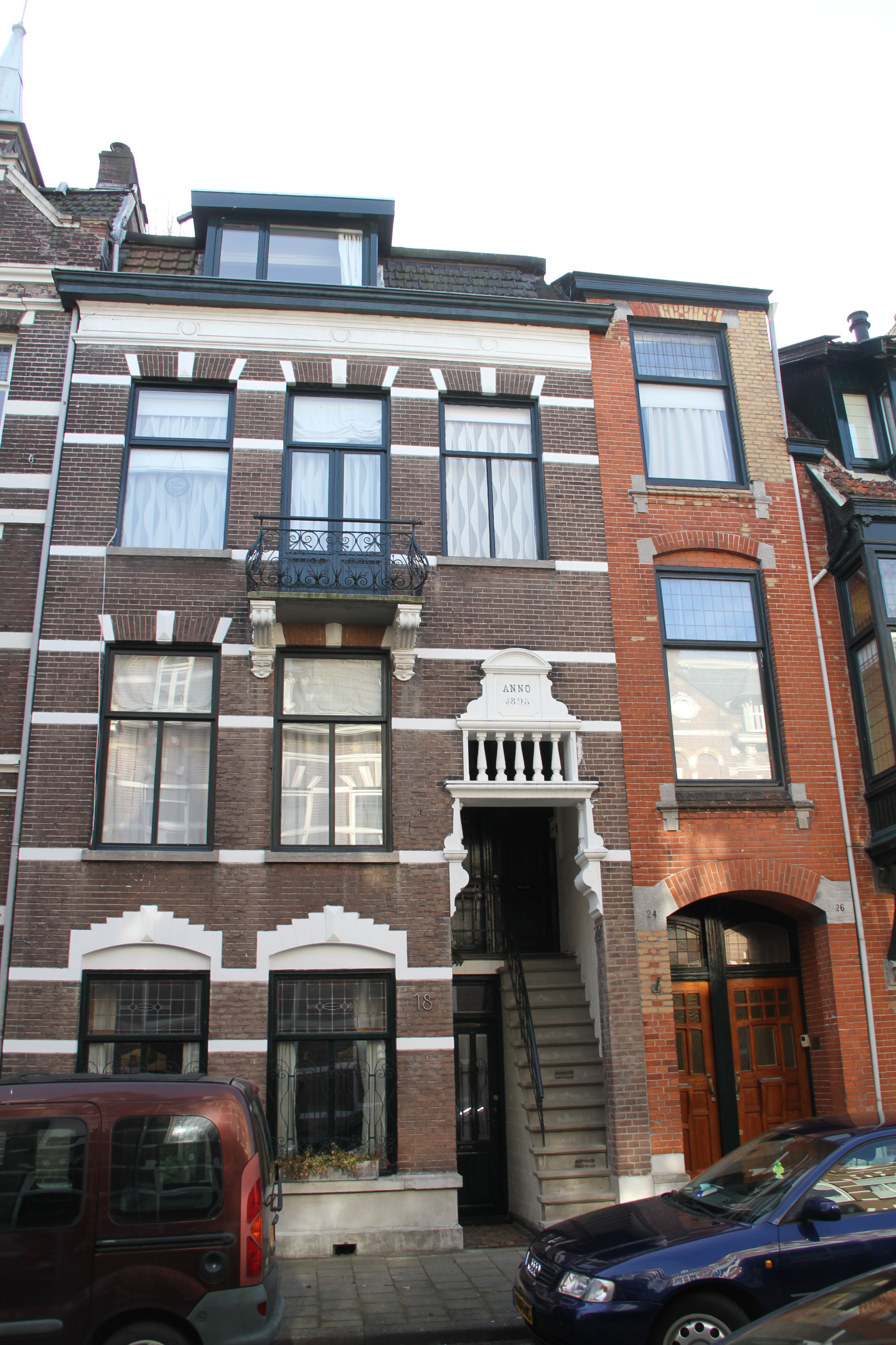 Het complex Luijbenstraat 18-22 bestaat uit drie portiek-etagewoningen, die in 1898 in een eclectische stijl zijn opgetrokken. Het bouwwerk maakt deel uit van de gaaf bewaarde zuidelijke straatwand van de Luijbenstraat. Sinds februari 1991 staat het geregistreerd als gemeentelijk monument. Het betreft hier een tussenhuis van drie bouwlagen met zolder, met een breedte van drie traveeën. De gevels zijn gleed met gepleisterde speklagen in machinale baksteen, gemetseld in kruisverband. Het pand heeft een samengesteld plat dak, met een met pannen gedekt schild aan de voorzijde. De vensters zijn recht gesloten en hebben T-ramen. De gevel heeft een samengestelde hardstenen plint. De vensters op de begane grond zijn getoogd met een witte hanenkam (= strek waarvan de bovenzijde verspringend of boogvormig is). De vensters hebben T-ramen met glas-in-lood in de bovenramen. De rechtertravee wordt in beslag genomen door een over twee bouwlagen doorlopende ingangspartij. Deze heeft een fraai gedetailleerd bovengedeelte met voluutvormige (= spiraalvormige versiering) consoles en halfzuiltjes. Daarboven bevindt zich een opengewerkt deel met vijf balusters en een van wangen voorziene aedicula (= tempeltje) waarop de tekst ANNO 1898 vermeld staat. In de hierachter liggende, grotendeels betegelde hal bevinden zich de ingangen van de drie woningen. Deze zijn voorzien van houten paneeldeuren met stijlornamenten. De twee bovenwoningen zijn bereikbaar via een steile, hardstenen trap. De beide verdiepingsvensters zijn recht gesloten met strek en centrale diamantkop en hebben T-ramen. De vensters op de tweede verdieping zijn in detaillering hieraan identiek. Het balkon is centraal geplaatst en heeft een door bewerkte consoles gedragen hardstenen voetplaat en een gekruld, ijzeren hekwerk. Het fries is sober geornamenteerd met casementen (= verdiept veld) en cirkels. De achterzijde van deze portiek-etagewoningen bestaat uit enkele blokvormige bouwvolumes onder platte daken. Deze hebben geen bijzondere detaillering. De ornamentiek van het interieur is sober en grotendeels gewijzigd. |
