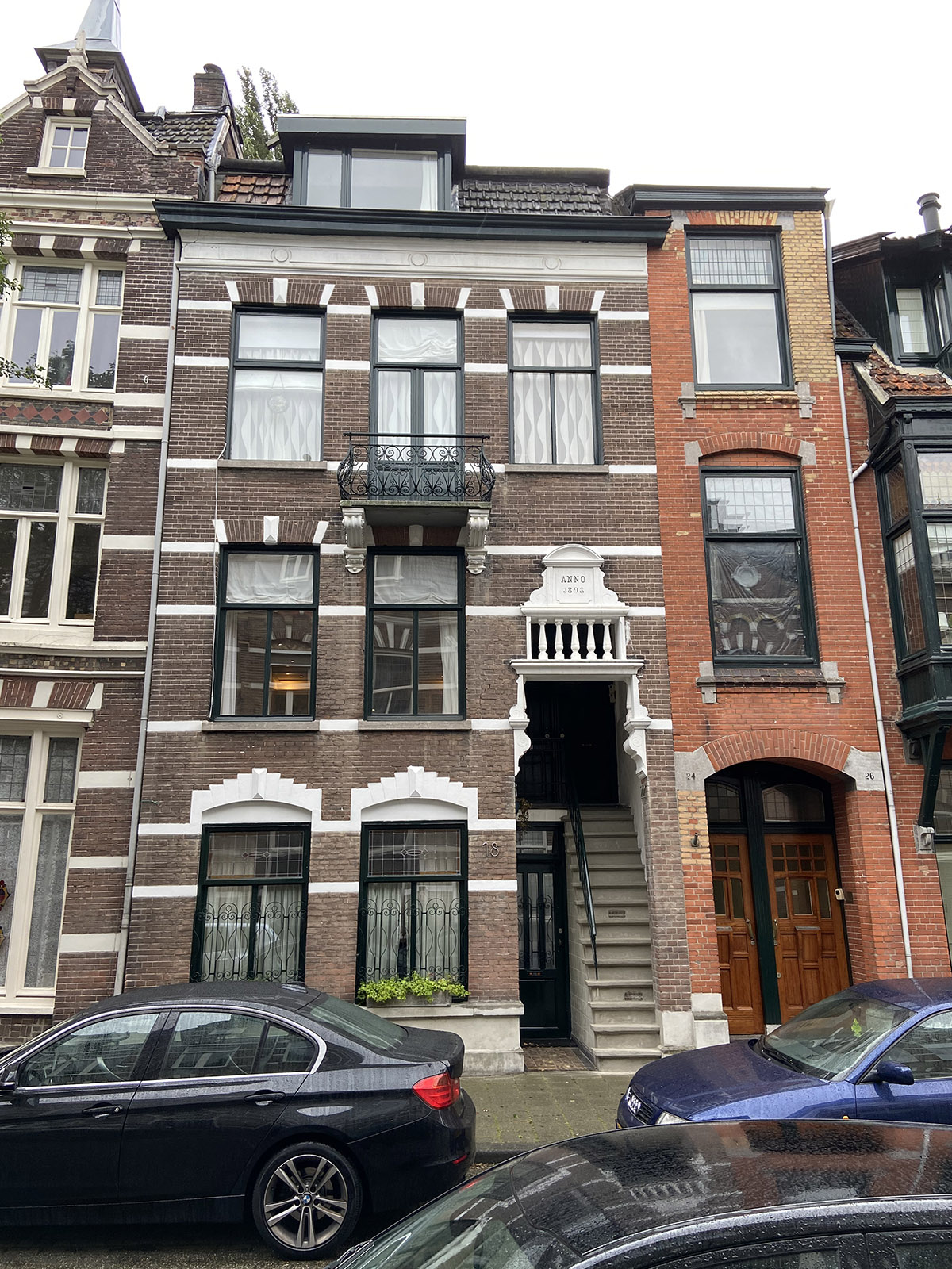 InleidingPortiek-etagewoningen, gebouwd in 1898 in een Eclectische stijl. Het pand bestaat uit een souterrain, een beneden- en een bovenwoning en maakt deel uit van de gaaf bewaarde zuidelijke straatwand. De Luybenstraat is een in totaliteit gaaf gebleven secundaire verbindingsstraat tussen de hoofdas in noord-zuidrichting van de wijk en de westelijke wijkbegrenzing (singel).OmschrijvingTussenhuis van drie bouwlagen met zolder met een breedte van drie traveeën. Met gepleisterde speklagen gelede gevels in machinale baksteen, gemetseld in kruisverband. Het pand heeft een samengesteld plat dak met een met pannen gedekt schild aan de voorzijde. De vensters zijn recht gesloten en hebben T-ramen. De gevel heeft een samengestelde hardstenen plint. De vensters op de begane grond zijn getoogd met een witte hanenkam. De vensters hebben T-ramen met glas-in-lood in het bovenlicht. De rechter travee wordt in beslag genomen door een over twee bouwlagen doorlopende ingangspartij. Deze heeft een fraai gedetailleerd bovengedeelte met voluutvormige consoles en halfzuiltjes waarboven zich een opengewerkt deel bevindt met vijf balusters en een van wangen voorziene segmentaedicula waarop ANNO 1898 vermeld staat. In de hierachter liggende, grotendeels betegelde hal bevinden zich de ingangen van de drie woningen. Deze zijn voorzien van houten paneeldeuren met stijlornamenten. De twee bovenwoningen zijn bereikbaar via een steile hardstenen trap. De beide verdiepingsvensters zijn recht gesloten met strek en centrale diamantkop en hebben T-ramen. De vensters op de tweede verdieping zijn in detaillering hieraan identiek. Het balkon is centraal geplaatst en heeft een door bewerkte consoles gedragen hardstenen voetplaat en een gekruld ijzeren hekwerk. Het fries is sober geornamenteerd met casementen en cirkels.De achterzijde van het pand bestaat uit enkele blokvormige bouwvolumes onder platte daken. Deze hebben geen bijzondere detaillering. De ornamentiek van het interieur is sober en grotendeels gewijzigd. WaarderingHet woonhuis is van algemeen belang. Het heeft cultuurhistorisch belang als bijzondere uitdrukking van de sociaal-economische ontwikkeling, namelijk de stichting van woningen in de eerste stadsuitbreiding van 's-Hertogenbosch. Het is tevens van belang als voorbeeld van de typologische ontwikkeling van de portiek-etagewoning. Het object is van architectuurhistorisch belang door de toegepaste eclectische stijlelementen en detaillering. Het huis is van belang vanwege de architectonische gaafheid van het exterieur. Het is van belang vanwege de architectuurhistorische, bouwtechnische en typologische zeldzaamheid. |