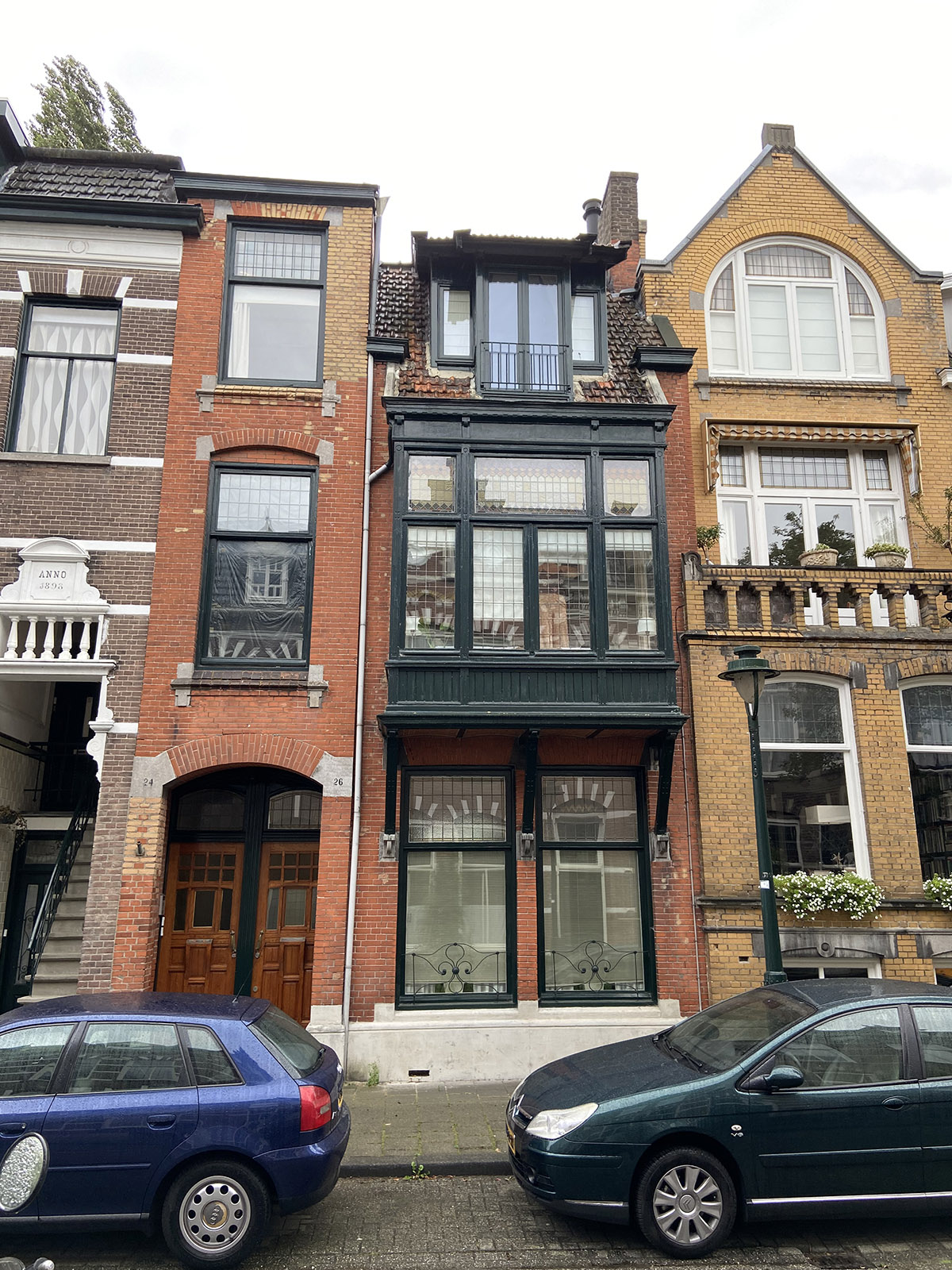 Intern is de indeling grotendeels oorspronkelijk met ruime kamers en suite. De ornamentiek is sober met geometrisch geornamenteerde stucplafonds en houten paneeldeuren. De tussenwoningen hebben een souterrain, twee etages en een kapverdieping. De gevels zijn opgetrokken in schoon metselwerk van gele verblendsteen. De daken zijn plat met een met rode kruispannen gedekt schild aan de voorzijde en een dwarse steekkap. In oorsprong waren in dit type een boven- en benedenwoning gevestigd waarbij het souterrain voornamelijk tot verblijf voor het personeel van de benedenwoning diende. De voorgevel met hardstenen plint is gemetseld in kruisverband en is geknipt en gesneden gevoegd. Elke woning bestaat uit twee traveeën waarvan de naar de centrum van het bouwblok gerichte als ingangsgedeelte dient. Middels hardstenen trappen met siersmeedijzeren hekken zijn de gekoppelde, geornamenteerde paneeldeuren voor de boven- en benedenwoningen bereikbaar. Deze zijn voorzien van sierlijk hang en sluitwerk in art nouveau-vormen. De ingangen hebben een luifel met golfplaten aan de bovenzijde. Het souterrain is via een aparte trap bereikbaar. De deur is hier aanmerkelijk soberder in ornamentiek dan de die voor de woningen. De vensters in de voorgevels zijn alle met een segmentboog getoogd en hebben enkelruits schuiframen met glas-in-lood in de bovenlichten. De vensters van het souterrain hebben aan de bovenzijde een geornamenteerd hardstenen kalf. De travee naast de ingang is in het souterrain en de bel-etage behandeld als een erker met balkon aan de bovenzijde. Dit is voorzien van een gemetselde balustrade met een geornamenteerde hardstenen bekroning van de hoekpenanten. Het balkon heeft openslaande deuren met glas-in-lood in de bovenlichten. In de steekkap van de kapverdieping is hierboven een halfrond venster aangebracht met een samengesteld raam met spaarzame elementen van art nouveau glas-in-lood. De topgevel heeft een hardstenen afdeklijst en bekroning. In het dakschild van de ingangstravee is een kleine, met pannen gedekte, dakkapel aangebracht. De goot boven de ingangstravee rust op gemetselde uitkragingen.