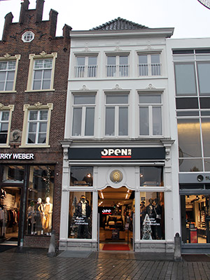 BeschrijvingAlgemeen:Het perceel omvat een bouwdeel aan de Markt, een binnenplaats en twee zelfstandige achterhuizen. De binnenplaats is thans bebouwd. Het bouwdeel aan de Markt heeft waarschijnlijk van oorsprong bestaan uit een voor- en een achterhuis; een indeling die thans alleen nog op kelderniveau is waar te nemen. Het bouwdeel omvat vier niveaus, namelijk kelders, begane grond, een eerste verdieping en een zolder onder een met gesmoorde golfpannen gedekt schilddak. De bouwgeschiedenis van dit bouwdeel dagtekent tenminste uit de late 15de / vroege 16de eeuw. Het eerste achterhuis dateert uit het begin van deze eeuw; achter op het vrij diepe perceel bevindt zich nog een eenlaags achterbouw. Op de kadastrale minuut uit 1832 is hier ook een achterhuis getekend, maar van de datering van de huidige bebouwing is niets bekend. Het rooilijn van het pand valt niet samen met de perceelsgrens: het smalle voorterrein voor het pand is voorzien van een natuurstenen tegelvloer, met daarin een kelderingang, en is afgezet met natuurstenen palen op de hoeken.Voorgevel:De voorgevel is een gepleisterde 19de-eeuwse lijstgevel met een neo-classicistische houten pui. De pui bestaat uit een houten opbouw op een natuurstenen borstwering. De houten opbouw met centrale ingang heeft aan elke zijde een geprofileerde pilaster die overgaat in uitkragende consoles met acanthusbladmotief, die de geprofileerde kroonlijst van de pui steunen. Op de eerste verdieping bevinden zich drie moderne vensters in de originele 19de-eeuwse kozijnen, uitgevoerd met een kwartrond profilering. Op de zolderverdieping bevinden zich drie draairamen met moderne hekjes als een frans balkon. Alle gevelopeningen zijn voorzien van een geprofileerde omlijstingen in stuc, afgewerkt met een geaccentueerde kuif.De gevel eindigt met een geprofileerde kroonlijst, die is voorzien van een cassettedecoratie, onder een uitkragende bakgoot. Linkermuur:Het pand heeft de linkerzijmuur gemeenschappelijk met het buurpand, Markt 27.Rechterzijmuur:Het pand heeft de rechterzijmuur gemeenschappelijk met het buurpand, Markt 23.Achtergevel:De achtergevel is een gepleisterde lijstgevel met op de eerste verdieping twee T- vensters en een deur en op de tweede verdieping een 2-ruits draairaam. | 1 |