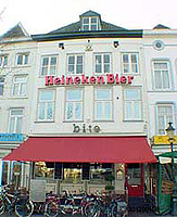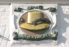 De voorgevel is een bakstenen lijstgevel van vier vensterassen breed, daterend uit de 18de eeuw. Links voor de gevel bevindt zich een groot kelderluik en iets verder voor de gevel ligt in het midden nog een luik van de straatkelder. Op de begane grond is rechts een ingang met een recente deur met bovenlicht en ervoor een hardstenen trapje van twee treden met korte gietijzeren balustrades in laat 19de-eeuwse vormgeving (uit 1991). Links bevindt zich een plint met daarin een liggend kelderlicht met gietijzeren rooster. Boven de plint is een recente pui voor het restaurant. Deze pui bestaat uit drie delen, waarbij in de bovenlichten van de twee linker delen glas-in-lood ramen uit de vroege 20ste eeuw zijn geplaatst, die vermoedelijk van de oude pui stammen. De penanten op de begane grond zijn gepleisterd, evenals een groot deel van de borstwering van de verdieping. Boven de begane grond is de gevel opgetrokken in metselwerk van handvorm baksteen, dat wit is geschilderd. Op de eerste verdieping bevinden zich vier vensters onder strekse bogen met hardstenen lekdorpels, kozijnen met kraalprofiel en recente ramen. Op de tweede verdieping zijn de vensters lager en zijn ze voorzien van houten lekdorpels en 4-ruits dubbele draairamen. Net boven de vensters bevind zich middenin de gevel een natuurstenen gevelsteen waarop een reliëf is gebeeldhouwd met onder andere een goudkleurig geverfde hoed, verwijzend naar de naam van het oorspronkelijke linker pand, “De Vergulde Hoed”. De gevelsteen dateert mogelijk uit de 17de eeuw. De gevel wordt afgesloten door een classicistisch hoofdgestel met een gepleisterde architraaf en fries en een houten kroonlijst.