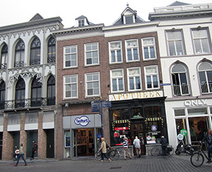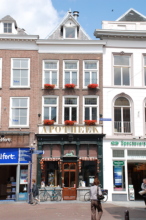 Al in 1672 was het pand in gebruik als apotheek, zij het dat rond 1750 een loodgieter er zijn nering had. Het pand is met zijn 4.5 meter breedte relatief smal, maar wel twintig meter diep. Vermoedelijk is 'De Oranjeboom' gebouwd kort na de grote brand die de stad in 1419 teisterde. Veel bouwdelen stammen nog uit die periode: de zijmuren, de kelder, de vloerbalken, de kapconstructie en de dwarsmuur die het middeleeuwse woonhuis verdeelde in een voor- en achterhuis. Aan het pand is in de loop van de eeuwen wel verbouwd en veranderd. De voorgevel dateert bijvoorbeeld uit de 18e eeuw. Toen hadden de vensters nog een indeling met kleine ruiten, maar die zijn in de 20e eeuw vervangen door grotere vensters. In het bovenlicht van de voordeur prijkt een eenhoorn. Het is een typisch element van de fraaie winkelpui, die evenals het interieur van de apotheek uit de 19e eeuw stamt. |