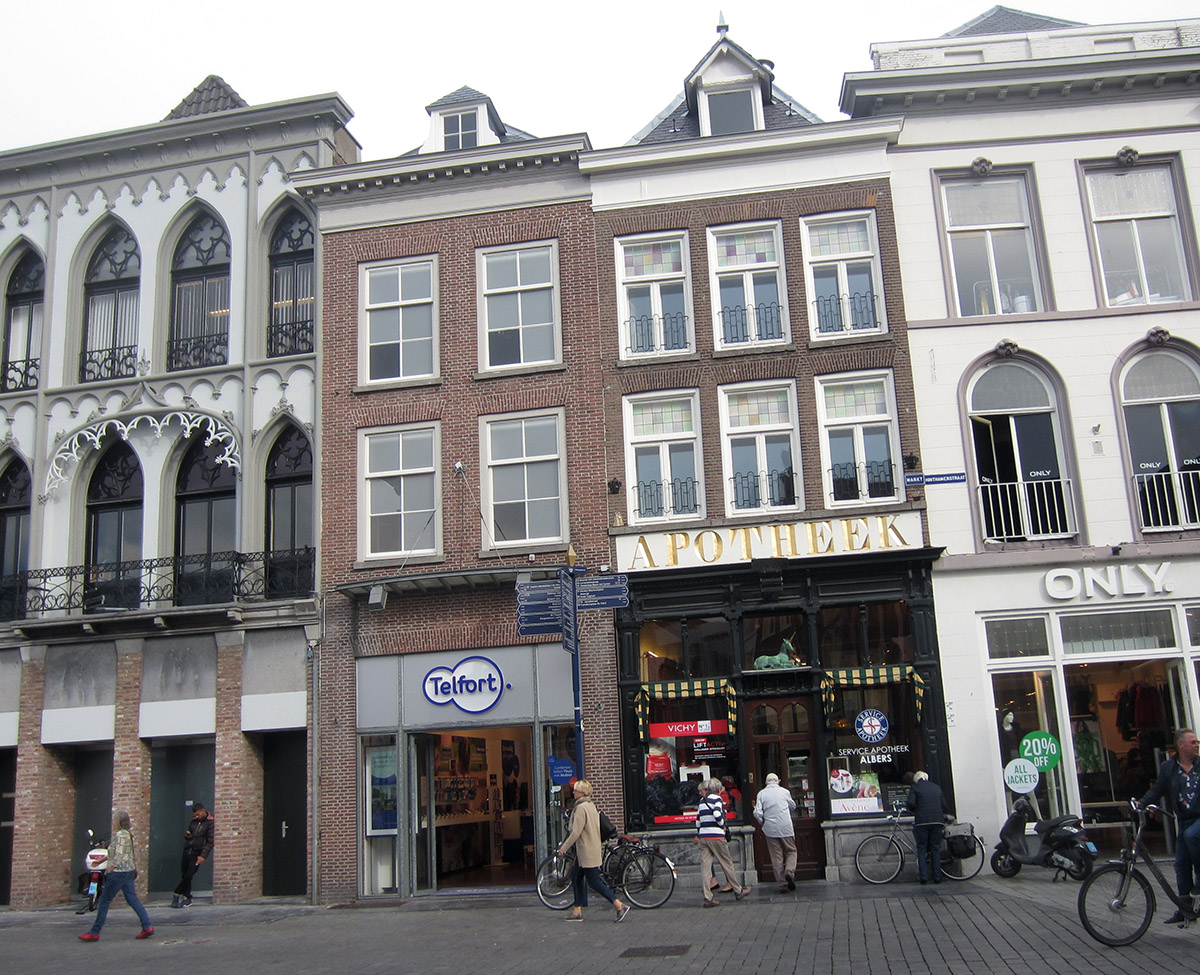 Markt 35Apotheek De OranjeboomDe oudste vermelding van dit huis als apotheek dateert uit 1672, maar in 1750 was het ook enige tijd in gebruik als loodgieterswinkel. De oorsprong van het huis gaat terug tot de 15e eeuw, toen het waarschijnlijk werd herbouwd na de grote stadsbrand van 1419. Het heeft de kenmerkende voor- en achterhuisindeling met houten binnenpui in het voorhuis. De fraaie voorgevel dateert uit het eind van de 18e of het begin van de 19e eeuw.Met name de winkelpui (19e eeuw) valt op, met een eenhoorn in het bovenlicht. Ook het gave winkelinterieur van de apotheek dateert uit deze periode.