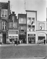 De bezitter van dit pand is in de eerste helft van de 16de- eeuw de ketelmaker Maarten Moens. De familie Moens blijft gedurende een groot deel van de 16de eeuw in bezit van het pand. Zij worden in het cijnsboek van 1520 aangeslagen voor 1/3 deel van een perceel van 35 voet. Dit is het brede perceel tussen de grote stenen huizen 'De Engel' en 'De Roodenburg', waarover bij het vorige pand geschreven is. Na de familie Moens moet de blauwverver Hendrik Surnels of Zierneels de hertogcijns betalen. Hij is waarschijnlijk niet de bezitter, aangezien bij de haardentelling van 1553 de weduwe Wolffs als zodanig vermeld wordt. Frans Havens is dan huurder. Hij moet voor vier schouwen betalen. De kelder wordt, zo blijkt uit de inning van de 100ste penning in 1569, samen met bovengrondse ruimten verhuurd. In de huidige kelder zijn geen bouwsporen van een stookplaats aangetroffen. De kelder, die vanaf de straat en mogelijk vanaf het achtererf bereikbaar was, bezat een iets boven het oude maaiveld gelegen tongewelf. Een dergelijke hoger gelegen begane grond, is ook aangetroffen in het rechter buurpand. De beide zijmuren lijken oorspronkelijk tot het pand te behoren. Ze waren voorzien van spaarnissen met rond- en spitsbogen en kunnen nog uit de 14de eeuw dateren. In 1960 zijn de bogen weggehakt tijdens een algehele vernieuwing van het pand. Op de 16de-eeuwse schilderijen staat het pand afgebeeld met een houten gevel. Op de begane grond bevinden zich een deur en een kelderingang, met daarboven een kruisvenster in het midden. Mogelijk hebben we hier te maken met een insteekverdieping. Op de eerste verdieping zitten twee kruisvensters, die op een woonfunctie duiden. In de top, die versierd is met een windveer in een driepas-vorm, zit een luik. | 212 |