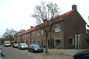 Eengezinswoningen met gespiegelde plattegrond. De voordeurpartij is als risaliet van geringe diepte uitgebouwd. Tussen de twee voordeuren twee smalle toiletvensters. De gevelwand van de voordeurpartij is voorzien van horizontale metseleffecten door middel van een terugliggende rode steen. Een blok wordt links en rechts afgesloten met een venstertravee waardoor het patroon 1-2-2-2-2-2-1 ontstaat. De blokken zijn voorzien van zadeldaken met geringe overstek, gedekt met rode en grauwe pannen van het type 'Hollands verbeterd'. Voor de woningen liggen klinkerstroken en een smal perk. Op het dak aan de achterzijde bevinden zich dakkapellen. Onder de goot van de achtergevel is een architraaf uitgevoerd in siermetselwerk. Aan de zijde van de evennummers aan de Maximiliaanstraat en de Philips de Schonestraat staan 5 garageboxen. Bij het blok aan de Philips de Schonestraat 12-26 loopt de risaliet over twee bouwlagen.