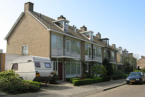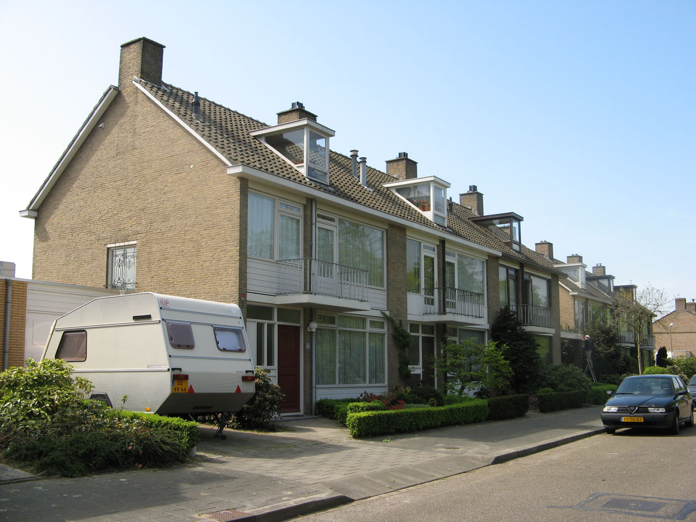 Drie bouwblokken bestaande uit een maal twee woningen onder een kap en drie woningen onder een kap. Gewapende gietbeton vloeren met balkon boven de toegangspartij. De gevelopeningen zijn voorzien van kozijn-puien. Zadeldaken met dakkapel. De woningen hebben een voortuin.