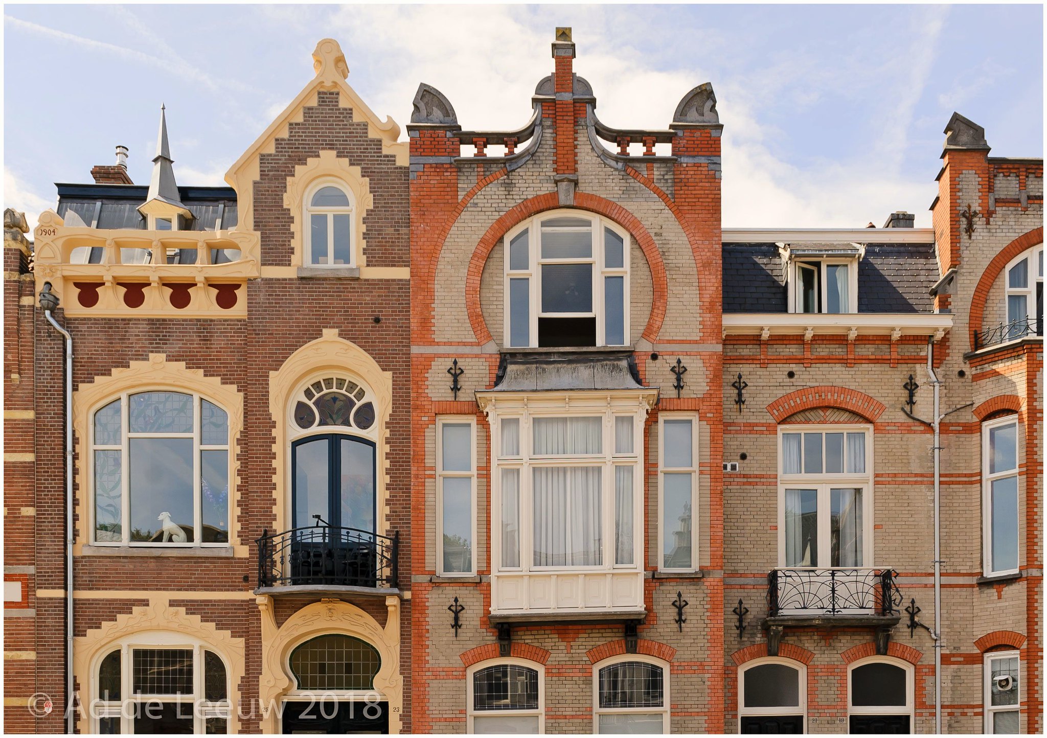 De drie gedeeltelijk onderkelderde bakstenen panden beslaan elk een L-vormige plattegrond en tellen aan de Oranje Nassaulaan twee bouwlagen en een kapverdieping onder een voordakschild gedekt met leien in Maasdekking; aan de Mayweg drie bouwlagen onder een plat dak. Aan deze gevel diverse tweelaags uit- en aanbouwen onder plat met verschillende hoogten. Dakschilden aan de Oranje Nassaulaan afgezet met noklijsten en voorzien van dakkapellen met stolpvensters onder lessenaardak. In het plat dak enkele daklichten. De in kruisverband gemetselde panden zijn voornamelijk opgetrokken in grijze kalkzandsteen voor de voorgevels en baksteen voor de achtergevels. De asymmetrische voorgevels aan de Oranje Nassaulaan bestaan per tussenwoning uit twee traveeën. In de rechtertravee op de begane grond twee beglaasde en betraliede entreedeuren met panelen met daarboven een balkon voorzien van smeedijzeren balustrade. De linkertraveeën van de nummers 11-13 en 15-17 komen architectonisch overeen: een driezijdig gesloten erker over twee verdiepingen, waarop een balkon met smeedijzeren hekwerk, wordt bekroond met een dakopbouw met hoektorentjes en borstwering waarin zich de in een hoefijzerboog ingebedde balkondeuren bevinden. De linkertravee van nummer 19-21 risaleert en bevat op de verdieping een uitgebouwde houten rechthoekige erker op consoles, eveneens bekroond met een dakopbouw met torentjes, borstwering en toppilaster boven een in een hoefijzerboog ingebed venster. De gevels worden verder geleed en verlevendigd door het gebruik van rode verblendsteen voor versieringen als speklagen, ontlastingsbogen en siermetselwerk; hardsteen voor de vensterdorpels, entreetrappen, brievenbussen, consoles, speklagen, cordonlijst, plint, aanzetstenen, gevelornamenten en als afdeklaag en (smeed)ijzer voor de balkonbalustrades, kelderroosters en diverse sierankers. Gevelopeningen rechtgesloten of onder segment-, rond- of hoefijzerboog. Deels versoberde vensters met bovenlichten voorzien van glas-in-lood of kleine roedenverdeling. Onderlangs de gevelwand een gemetselde plint en bovenlangs een goot op klossen, deels opgenomen in een fries met siermetselwerk. Achtergevels eenvoudiger uitgevoerd. Drie- en (aangrenzende) tweelaags uitbouw waarop balkon. Smalle tweelaags aanbouw onder plat in kruisverband met sierlaag in blokverband, aan de Mayweg afgesloten met een trapgevel waarop natuurstenen afdeklaag (bij nummer 15-17 gesloopt). Goot met bloktandlijst. Gevelopeningen onder segmentboog, strek of ijzeren latei met onder meer rechtgesloten T-vormige schuifvensters, grote samengestelde serrevensters en blindvensters. Een tuinmuur scheidt de percelen van de Mayweg. De (versoberde) muur, waarin getoogde houten klampdeuren toegang verschaffen tot het achtererf, is gemetseld in kruisverband met een sierlaag in blokverband en bekroond met een ezelsrug op een bloktandlijst. De opzet van de plattegronden is redelijk herkenbaar bewaard gebleven. Direct achter de entrees van de bovenwoningen volgt de trap naar de verdieping met grote (nu deels versoberde) kamer-en-suite. Benedenwoningen met een lange gang naar de aanbouw op het achtererf. Van de gemoderniseerde interieurs zijn onder meer van belang: originele kelders, deels met paneeldeur, plavuizenvloer en troggewelfjes; keukens met (restanten) schouwbalken en spekkastjes; hallen met enkele geprofileerde deurlijsten en paneeldeuren; woonvertrekken met enkele stucmedaillons, -lijsten en marmeren schouwen; trapportalen, deels met sierlijk gesneden trapbalusters.