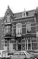 Gevelopeningen onder lichte segmentbogen en rondboog (topgevel) met getoogde en rondboogvormige kozijnen voorzien van deels versoberde een- en driedelige schuifvensters, dubbele balkondeuren en een beglaasde en betraliede entreedeur met panelen. Achtergevel overeenkomstig, doch soberder gedetailleerd. L-vormige eenlaags uitbouw onder plat, bestaande uit een drie traveeën brede, gekoppelde serre- en achteruitganguitbouw waarop een breed balkonterras en een aangrenzend één travee breed volume (nu versoberd) met vide. Gevelopeningen met onder meer stolpvensters onder ijzeren lateien en rollagen. De opzet van de plattegrond is bewaard gebleven. Lange middengang leidt naar het achtererf. Ter linkerzijde kamer-en-suite met serre, ter rechterzijde een voorkamer, het trapportaal en de keuken met toilet en kelderingang. Verdiepingen met diverse afzonderlijke voormalige woon- en slaapvertrekken rondom het centrale trappenhuis.