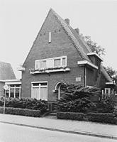 Redengevende omschrijvingWoonhuis op L-vormige plattegrond, gebouwd in 1934, van één bouwlaag met zadeldak tussen topgevels.Woonhuis op L-vormige plattegrond. Zadeldaken met steile topgevels waarvan er een naar de straat gericht, waarin hoofdingang met rondboogkozijn met deur en vooruitstekende halfronde luifel. Gevels gemetseld in halfsteens verband en strak met cement gevoegd. Topgevel beëindiging met siermetselwerk bestaande uit bakstenen op z'n plat in blokverband. Topgevel verder strak afgewerkt zonder overstek met eindgevelpannen. Hoog in topgevel zeer smal hoog raam. Uitbouw ter linkerzijde eveneens met topgevel zonder siermetselwerk. Houten raamkozijnen met middenstijlen, kalf en ramen. In bovenlichten glas-in-lood. Op verdieping gekoppeld raamkozijn. In rechter zijgevel een iets uitspringend trappenhuis met platdak en smalle trapsgewijze lichtopeningen. Verder naar achter een keuken-uitbouw onder pannen dak. Het gehele dak gedekt met gesmoorde verbeterde Hollandse dakpannen. Aan dakvoeten ruim overstekende houten bakgoten. Op de linker hoek van straatzijde een houten serre uit omstreeks de bouwtijd met glas-in-lood in de ramen en met platdak afgewerkt. Mooi voorbeeld van architekt Adrianus van den Bosch. Het pand is van cultuurhistorische waarde vanwege zijn traditionele bouwstijl met invloeden uit de Amsterdamse school. | 1 |
